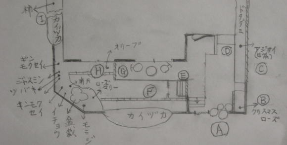 (H)棚の部分 (G)中央トリリス部分 (D)玄関ドア横 (C)東側奥 (B)東側前