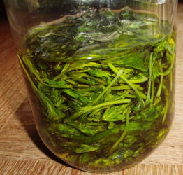 そうしたら、「バジルだけのオイルは、強すぎる」と言われ、少量にオイルを足して、ニンニクやローズマリー等を入れ作り直しました