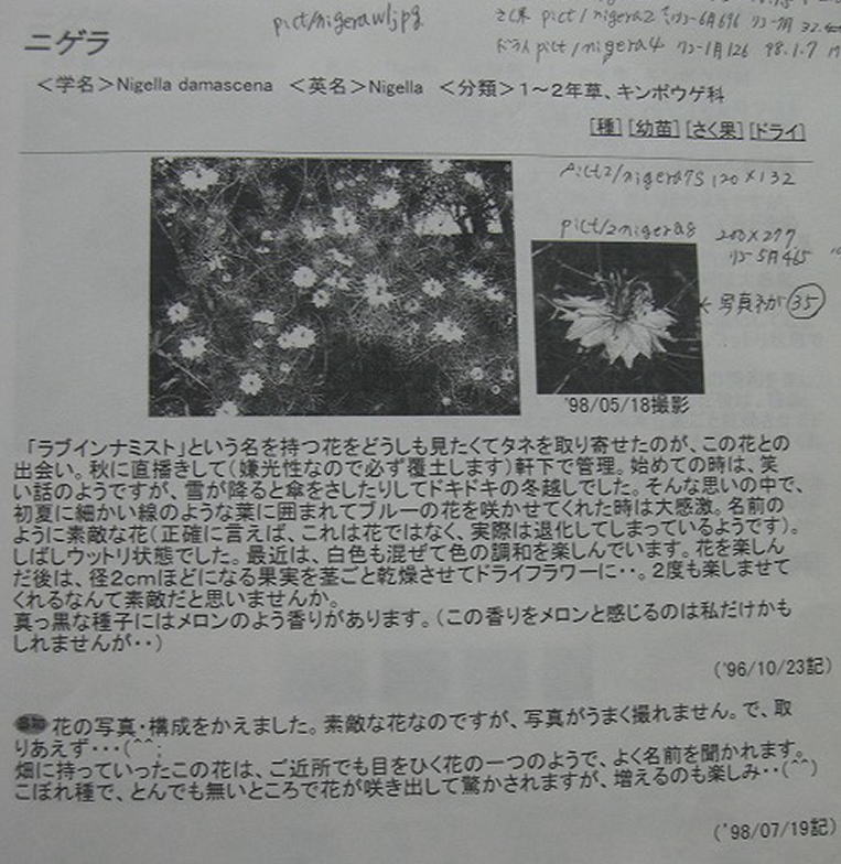この花を見たくて、今春、種を蒔いたのですが、失敗しました 時期が少し早かったので、家の中で見守っていたのですが、出てこない 時期が来たからと、直蒔きを試みたのですが、これも芽が出る様子が全く無い 結局、諦めたのですが、何が悪かったんでしょう? 土? 土の被せすぎ? それにしても1本も顔を見せないなんんて・・・ 来年、頑張ります(’14/05記)