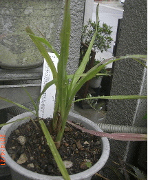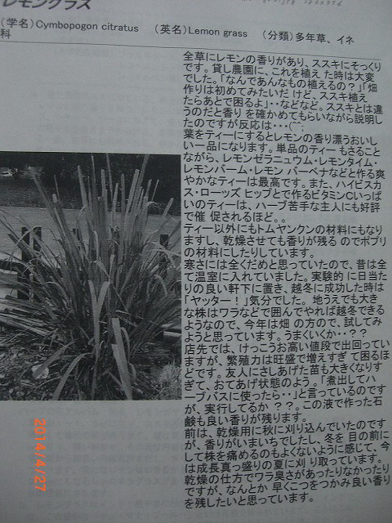 畑で大きくなったレモングラスですが、これも枯れ、家のも温室に入れられず絶えてしまいました レモニィティが飲みたくて、今春、苗を購入しました 2階の温室には運べそうもないし、冬越しを今から考えています(’14/05)
