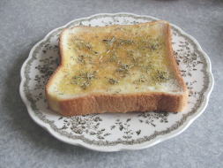 オリーブオイルにニンニクやハーブを漬けこんだ物をパンに塗り、乾燥ローズマリーをのせて、私の昼食です (本当は、この上にジャムを乗せてしまってます) ローズマリーは、脳の活性化や末梢神経に良いようで、私には、欠かせません(笑)
