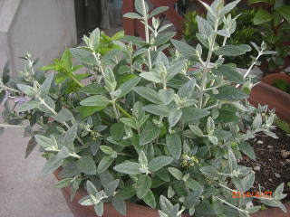 <ツリージャーマンダー> これは、大鉢に植えて有ったせいか、しっかり残りました。 最初は、ぼうぼうで、何がなんだか解らなかったのですが、古い枝をはらって、新芽を優先したら、綺麗な葉色になりました 花は、色が薄いので、目立たないのが残念