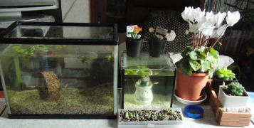 チビちゃん水槽の前には多肉植物の葉刺しの赤ちゃん(葉を置いておくと芽が出る)