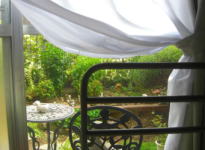 ベッドの柵が邪魔していますが、部屋の中から見える庭です