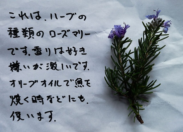 気持ちが乗っている時は、大胆なこともできるものですね。家から持ってきたローズマリーが、何年かぶりに花がいっぱいつきました。 その花枝を切って紙に貼り、説明を書いて、ロビーの机の上に置いておきました。「 これ 家にあるわ」などと言いながら、見てくださったようです。それを聞いて、嬉しい気持ちでいっぱいでした。