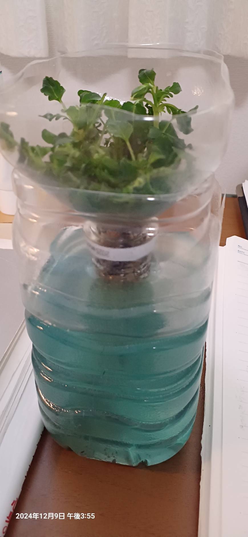 病院に入る前から考えていた ビオラの水耕栽培。種まきの時期は 過ぎてしまいました。でも元気になってきたら じっとしていられない私。種からではなく 苗を使っての水耕栽培を やってみることにしました。これは スマホで探しても なかなか出てきませんが ペットボトルを使うことや 液肥を使うことは 同じです。苗の土を落として まずはやってみました。12月5日から12月9日までは 花が一輪ずつ 咲いていたのですが 10日には 葉っぱがちょっとおかしい ドキ。でも古い葉の下に 新しい葉があるのを発見。しおれかかった 葉は ハサミで切ってしまいました。「小さくなったね」と みんなに言われたのですが 私のカンでの実験。 ドキドキはしているのですが 毎日の様子を見るしかありません。ここまでの様子を 写真に撮りました。見たら ビックリしますよ。