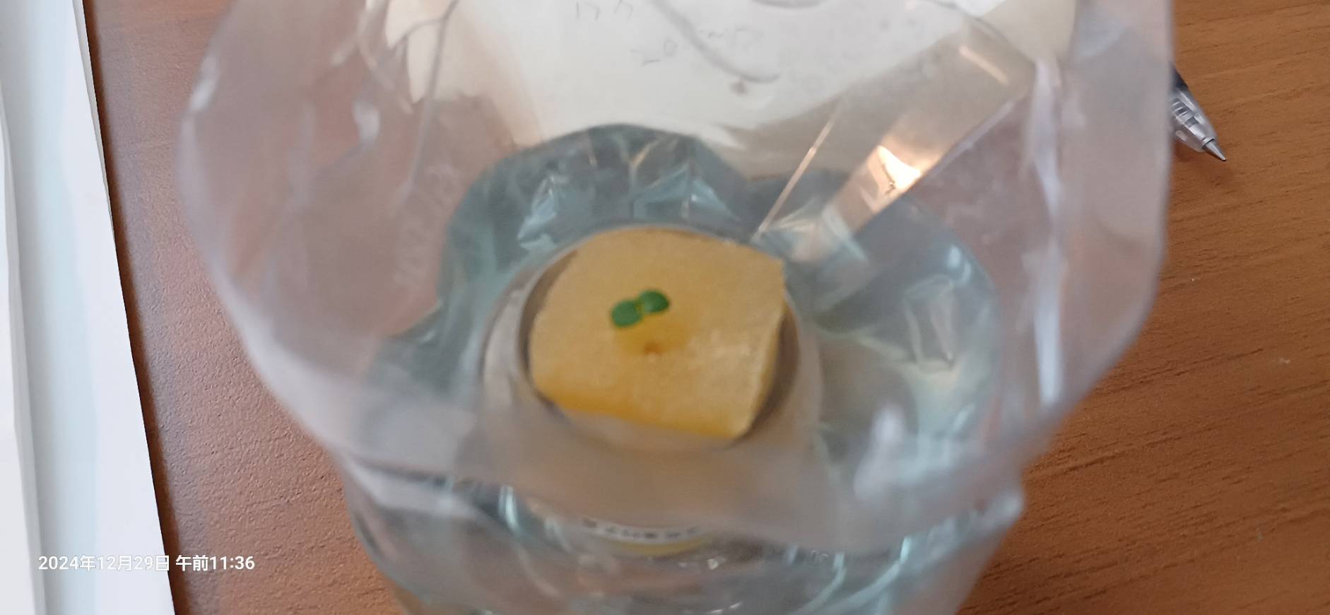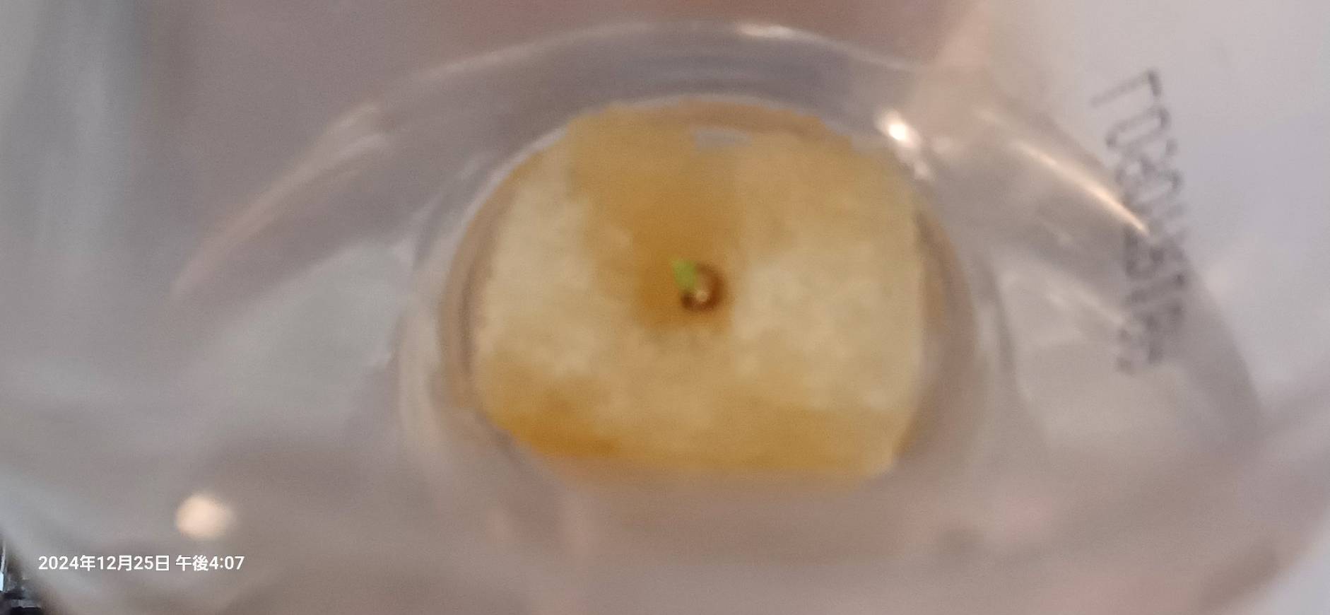 それから4日目で 緑色の物が かすかに見えました。 その翌日 緑色のものは 小さな双葉に変わっていて 嬉しくって 毎日暇があれば 見ています。