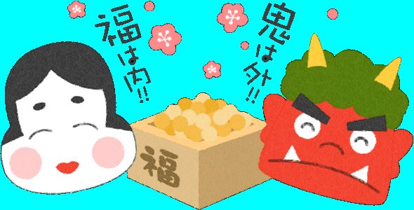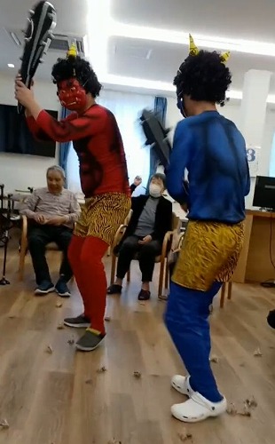 ホールで 全員一緒に座ったら ドアの入り口から 真っ赤な姿の赤鬼さんと 青の姿の青鬼さんが 空気を入れた棒を持って現れました。 鬼が 近づいてくるたびに 「鬼は外 福は内」と豆を 投げますが なかなか当たりません。 わいわい言いながら みんな頑張ったんですが・・・。最後に 一人ずつ 赤鬼さんと 青鬼さんに 囲まれて写真を撮ってもらいました。久しぶりに 大笑いし 大きな声を出して 子供に帰ったようでした。後で 1年前の写真を見てみたら 髪の毛の色が違う。1年で黒かった髪の毛が真っ白。これには驚きました。普段 鏡を見ることなどないので 全く わからなかったのですね。本当のおばあちゃんになってしまいました。