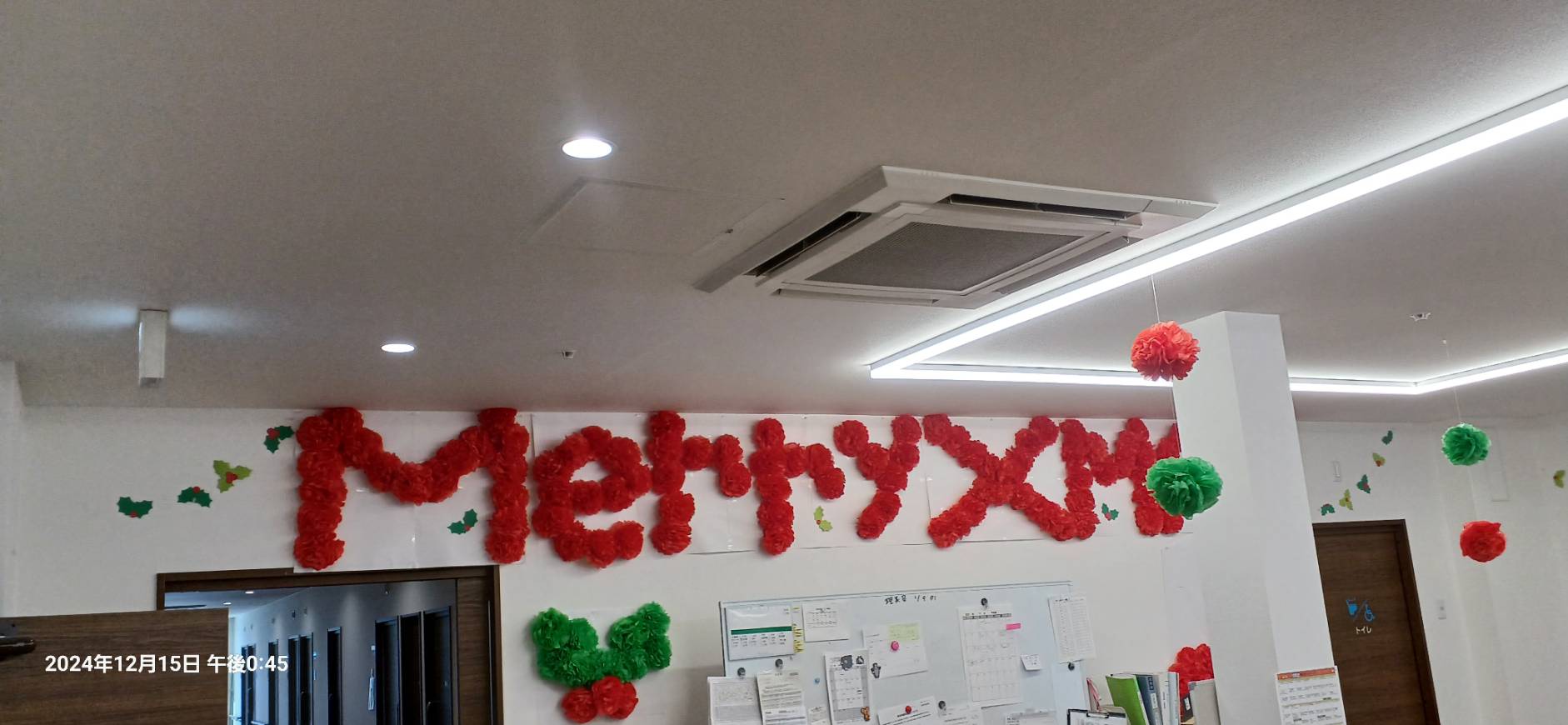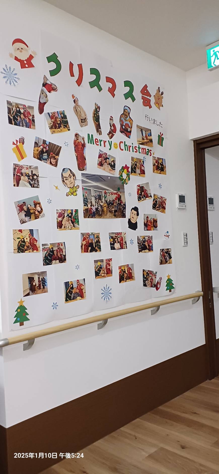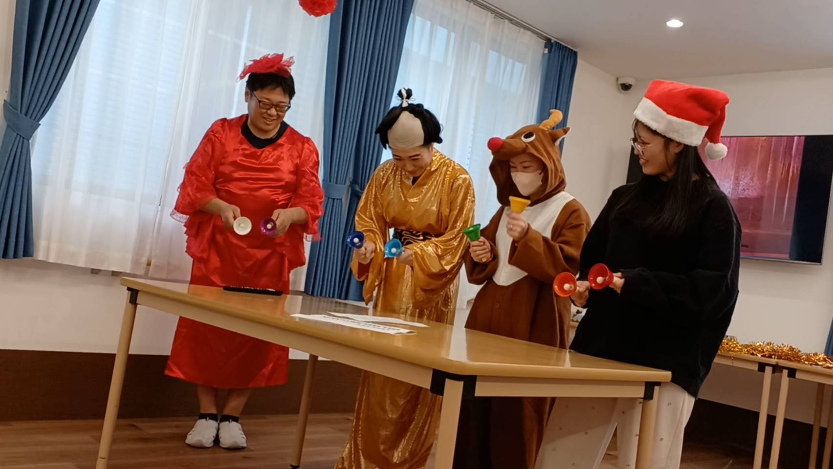 施設では いつもの午後のおやつの時を使って クリスマス会を開いてくださいました。 昨年と少し変わって サンタさん 、トナカイさん 、ツリー さんに加えて 松平健さん 、マツコデラックスさんに 扮した2人が加わってのメンバーです。 皆さんの前を ゆっくり飛び回りながら行く トナカイさんや マツケンサンバを踊る 松平健さん。そして「私は誰でしょう?」と出てきたのは マツコデラックスさん。 そんな自己紹介があった後 色々なことが始まりました。 トランプの手品や 1つのボールを 左右の手に動かして「さあ どっちの手にあるでしょう?」と 皆さんに手をあげさせるゲームには ついつい熱が入って 皆さん 大喜び 。 ハンドベルの演奏もありました。 その日に仕上げたとか。 それと 1人足りなかったみたいで 写真担当の方も加わっての演奏。 皆さん 上手に ハンドベルを鳴らされるのに びっくり! 聞き入ってしまいました。スタッフさんのお子さんの 電子ピアノの演奏もありました。 普段 友達の弾くのを見て覚えたとか…。 これもとっても上手でした。 みんなで クリスマスにちなんだ歌も いっぱい歌いました。 そして サンタさんとツリーさんに 囲まれて 1人ずつ写真を撮ってもらいました。