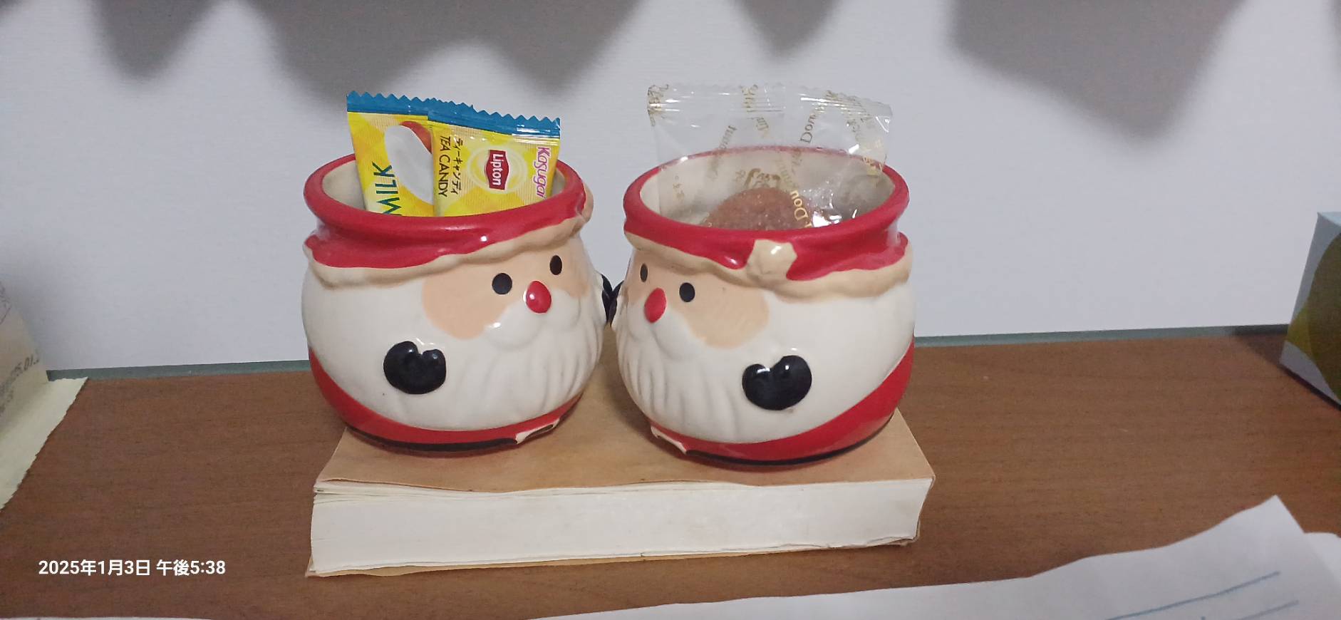 そうそう 昨年 2人で食べた 陶器に入った サンタさんケーキ。 食べた後の 陶器の器を どうしようかと考えていたのですが 小さな飴とか クッキーを入れることにしました。 いつも見えるところに置いてあります。