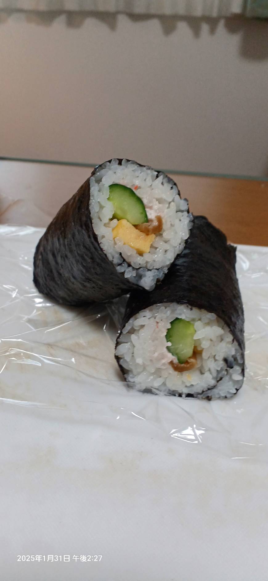 節分には早いのですが 主人が来る 今日 金曜日に 太巻きを おやつ代わりに食べました。 西南西を向いて 食べていると みんなでワイワイやった 節分の豆まきを思い出しました。 あんな時もあったのですね。 この施設で 主人と二人で 恵方巻きを 食べれるなんて 本当に 幸せです 。