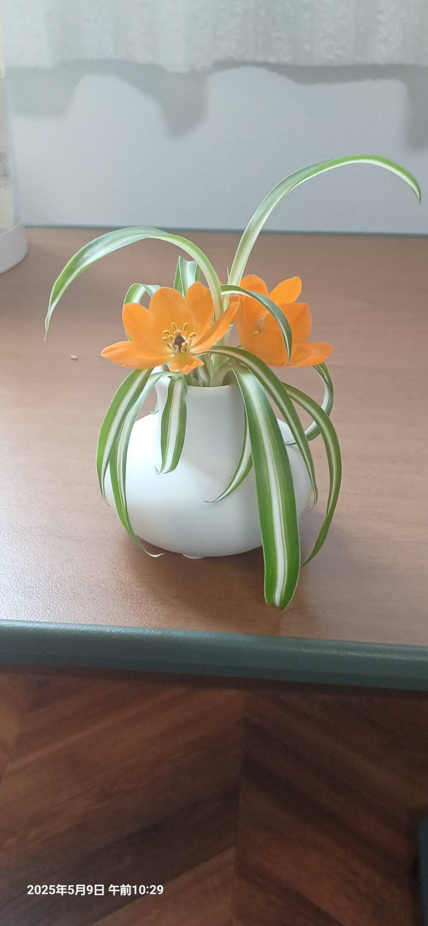 私は今までに 3人のケアマネ(ケアマネージャー)さんに お世話になってきました。 皆さん素敵な方ばかりです 今のケアマネさんは 本当に明るくて 大好き…。 今日も 突然いらして 私が車椅子で 歩く練習を話したら 大喜びしてくださいました。「今の調子だと 認定調査で 下がるかしら」とお聞きしたら「認定調査は2年後出し もし 下がっても大丈夫 」と言ってくださりホッ!!「今日はお土産があるの」と 袋の中から出されたのが 写真の花瓶。 葉っぱを見て ツルランだと思ったら 葉が くるくる巻いていくのだとか。 オレンジの小さな花は 白色の花瓶の色と 合っているし…。 ツルランが花を引き立てて 可愛い。 オレンジ色の花の名前を聞いたけれど 外国のものらしく 名前が覚えられませんでした。 ケアマネさんは 私の水差しが気になるようで アップルミントとレモンバームの根が伸びたものを 差し上げました 。 とっても喜んで 持っていかれたのは 私も嬉しいです。