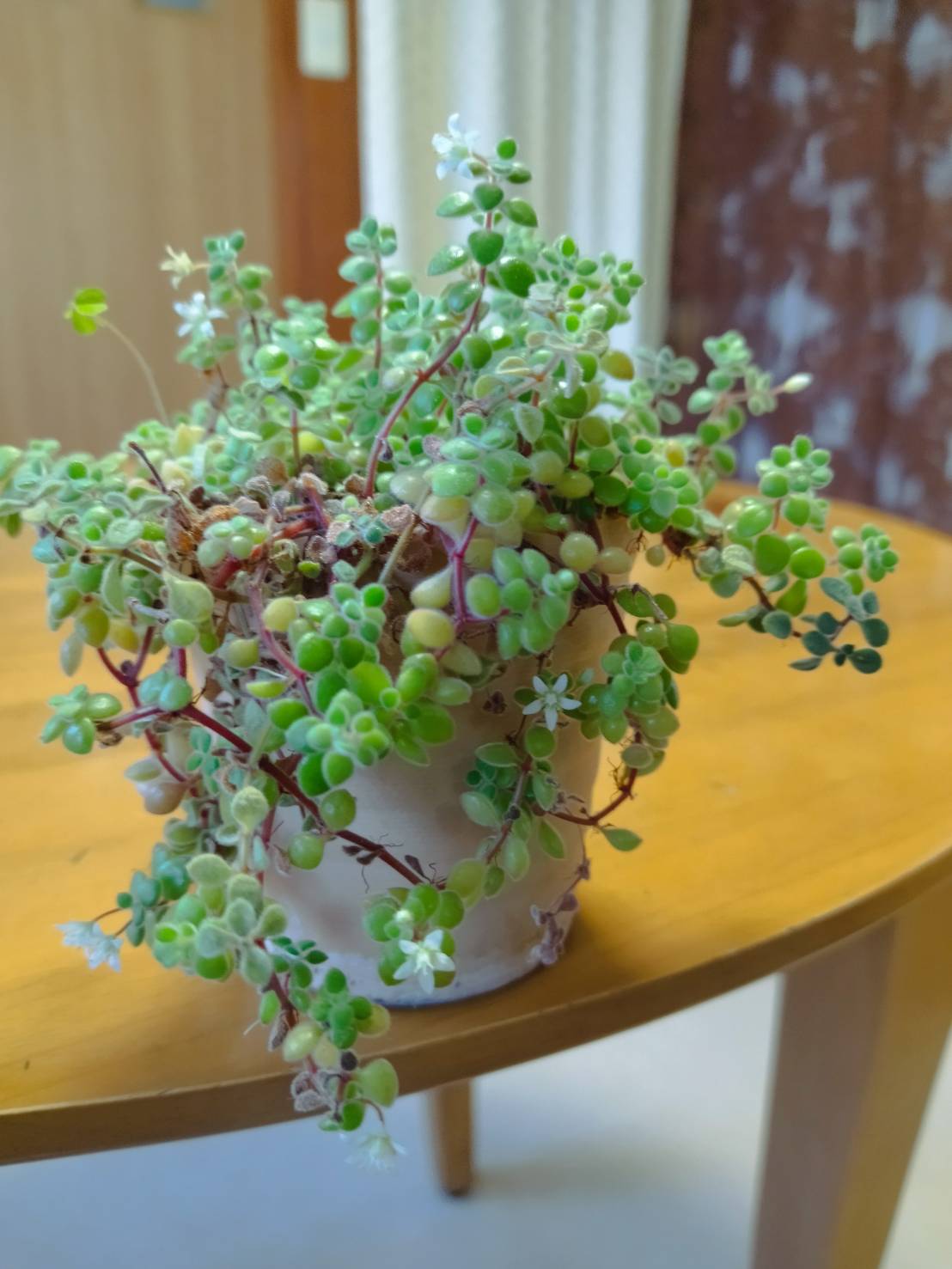 看護師さんに 隣の部屋の娘さんが 話したがっていると聞いて 何だろうと思ったら 種から目を出すキットの土に 白いカビが生えたとか。 土が こういう施設は ダメなんだと知ってらして 小さなキットを 買われたらしいです。 見た目に 土がびしゃびしゃ。 水が 上にあがるようにしてあるから それが原因じゃないかと まずは 水を与える時間を調整。 今の土は セットについていたものらしく まず それを 乾燥して 日光に当てて 白カビを退治する…。 そのぐらいしか 助言できなかったけれど 後で スマホを見たら 同じようなことが 書いてあったので ホッー`! 寝たきりのお母様が 花がお好きだったので 一輪でも置いておきたい 娘さんの気持ちが 嬉しいです。 明日 我が家で咲いた 八重のつるバラの花と 水差しにしたハーブを 一度 お持ちすることに なっています。 気に入ってくださるといいのですが…。