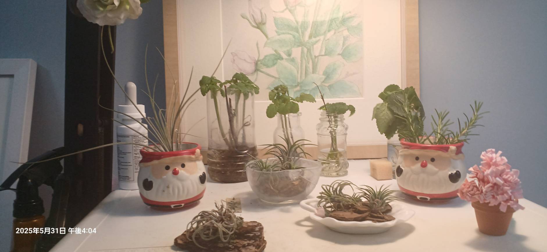 私の冷蔵庫の上の植物がどんどん変わって 今は エアープランツの勢いがよく 小株が育っています。 ハーブ類は アップルミントがまとめて暴れているだけになってしまいました。れでも クフエとベゴニアの花が 少し咲いています。