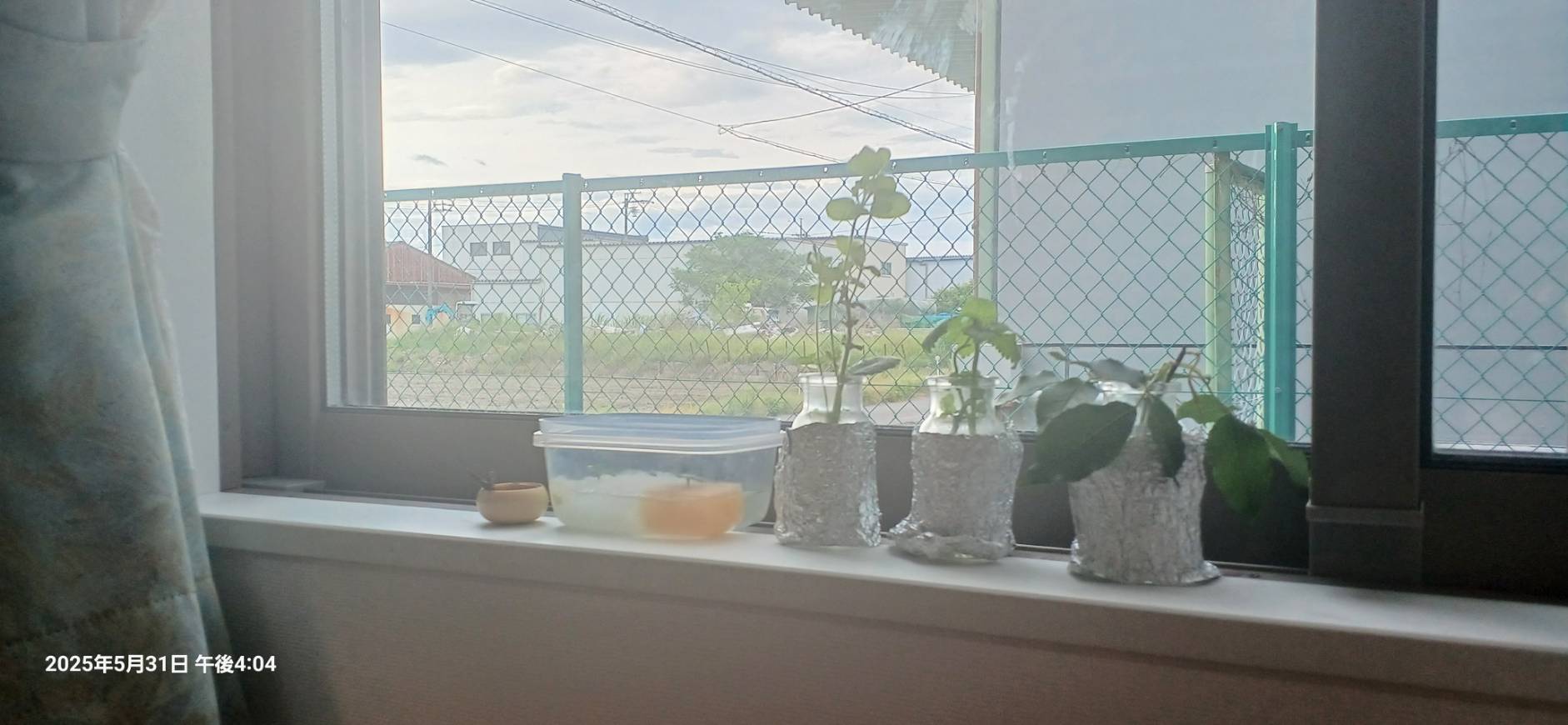 やはり ここは 日の光が入らないのが 一番の問題だということに やっと気がつきました。 かすかに窓から 日光が入ってくるのを感じて 窓辺に これだけ置いてあります 。 ミニひまわりの本葉出そうになっている入れ物と 我が家にあったつるバラを ここに置いてあります。 うまくいけば 芽が出るかもしれません。 あとは アップルミントが2つ。今 私の 大好きないろんな植物を かわいそうな目に合わせているのかなって 思ったりもしますが「付き合ってね ごめんね」って いつも言っています。 でも世話をすること 花を見ること それが私の 今の楽しみなんです。 本当にごめんね。そして家から花を切ってきてくれる主人に 感謝しています