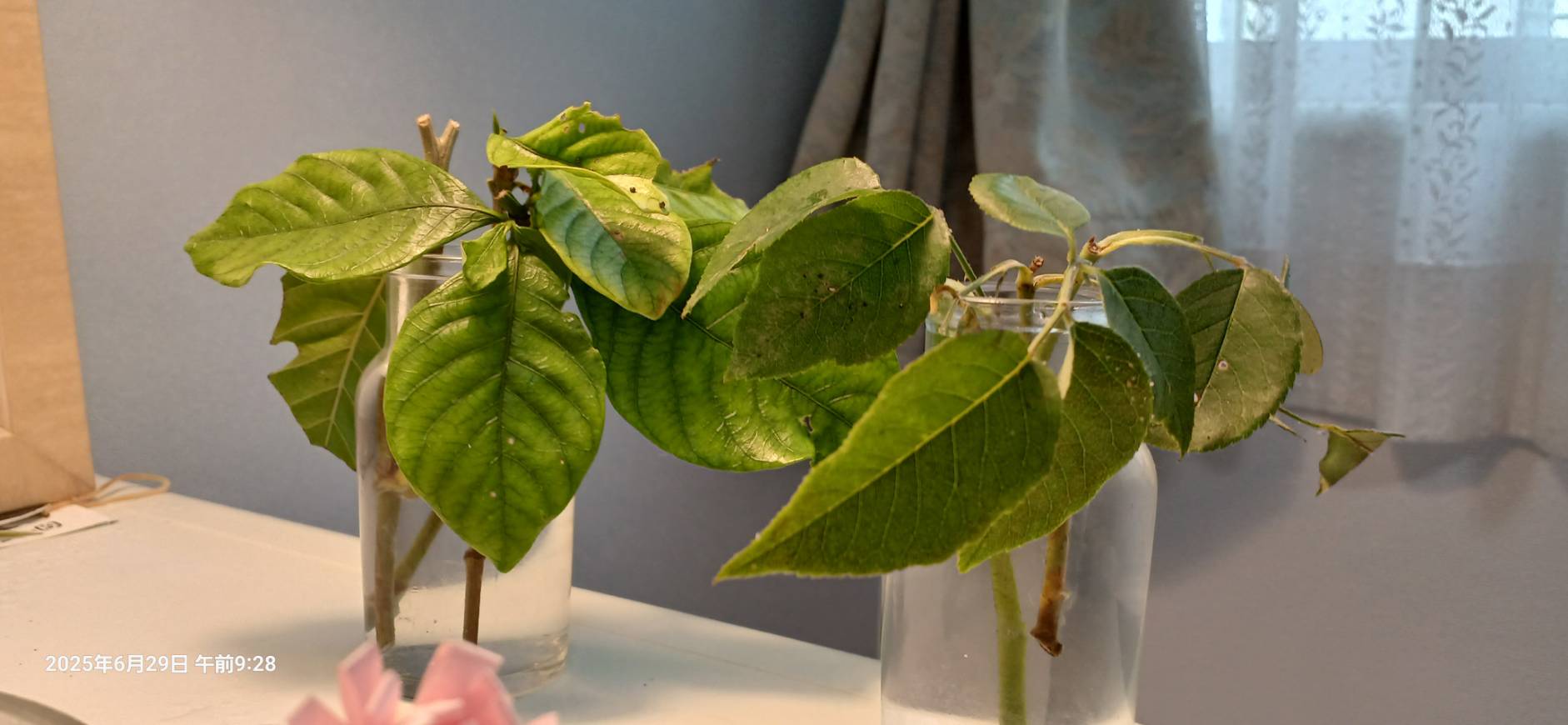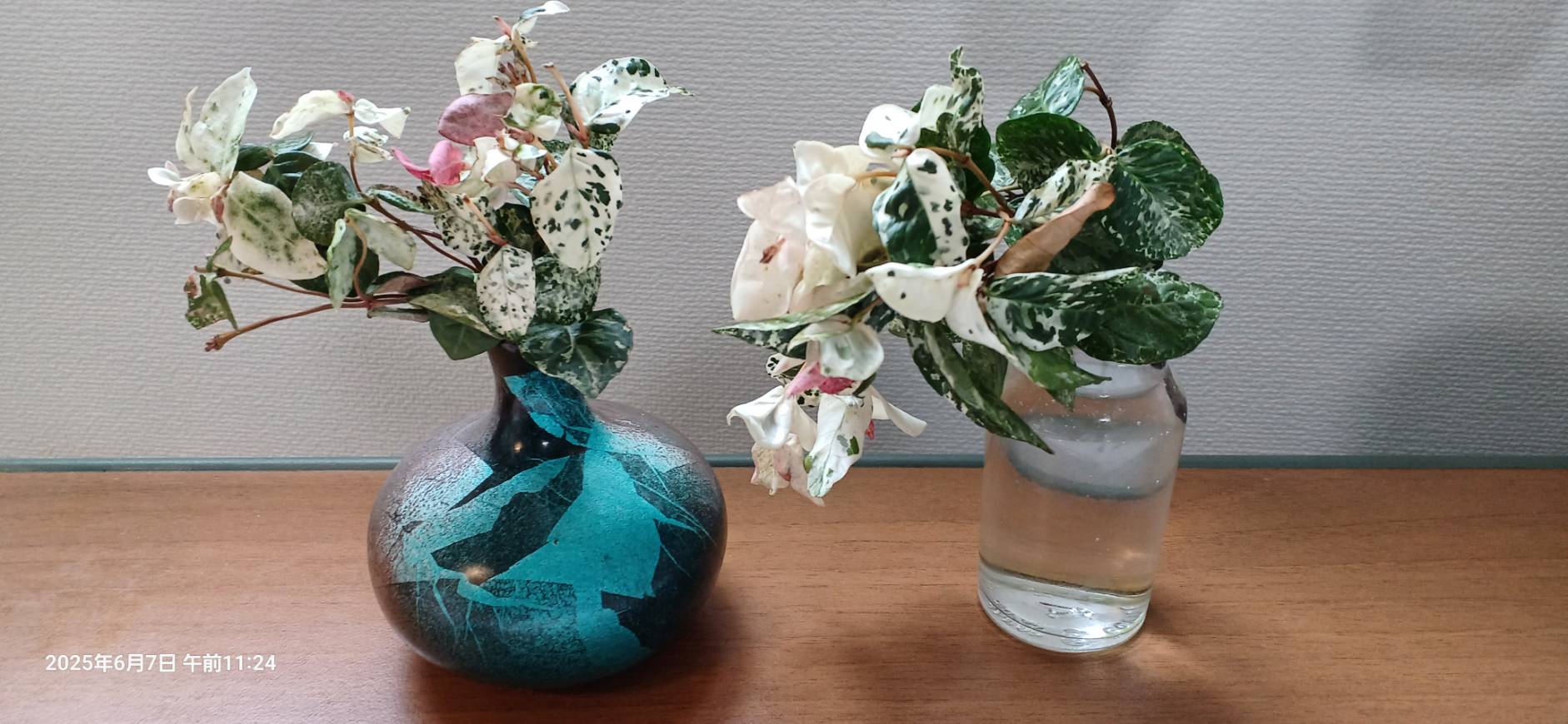 あとは 根が出ればと バラとくちなしの葉を 水差しにしているだけです。 でも緑色の葉が見えるだけで嬉しいです。 このような水差しは 水耕栽培に何度も挑戦したものの 成功せず諦めた今 これからも続いていくと思います。 どんな水差しが増えるか? ですが…。
