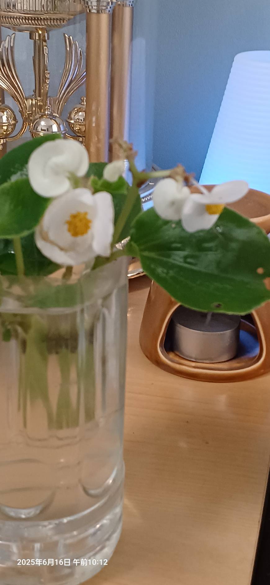 朝から いわし1匹の煮物を食べたせいか 何だか胃が気持ち悪いです。 これでお昼の食事内容によっては これ以上になるかと思うと ちょっぴり悲しいです。 テーブルの3人と完食を目指しているので 負けられません(笑)。不思議なことがあります テーブルの方にも ベゴニアの花を 少々飾ったのですが 花が全く落ちません。 もう数週間経ちます。 食堂の明かりが ちょうど合うのでしょうか? それとも 空気の流れができるからでしょうか? 不思議です。 一緒に入れておいた ハツユキカズラも 葉が とっても元気で 綺麗なんですよ?? 私の机の上に置いてあるのは ハラハラするほどの葉の状態なのに… ガックン
