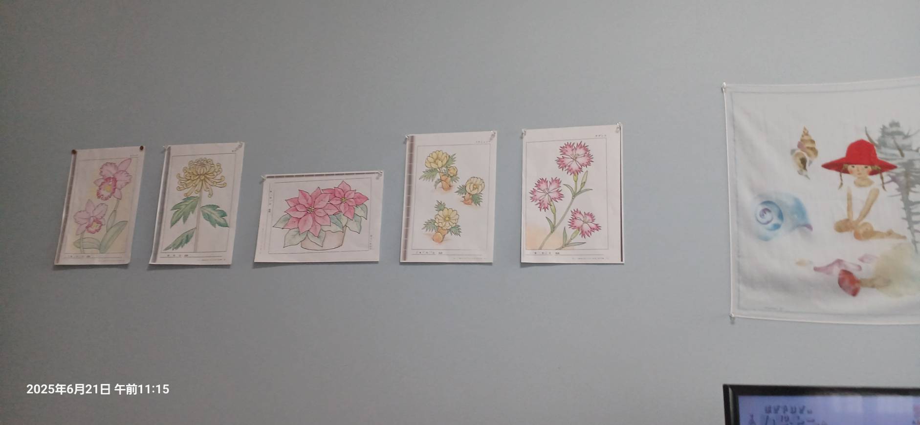 この暑さ 家でもエアコンはあるのですが そんな部屋で じっとしている人ではないので 心配していたのですが 元気そうで一安心。 前に塗った塗り絵を あいているところの壁に 貼ってもらいました。 大した塗り絵ではないのですが 花の絵なので 心が落ち着きます。 ただ後で思ったこと。 あの貼り方では ちょっと小学生の教室みたいだなって 思いました(笑)。