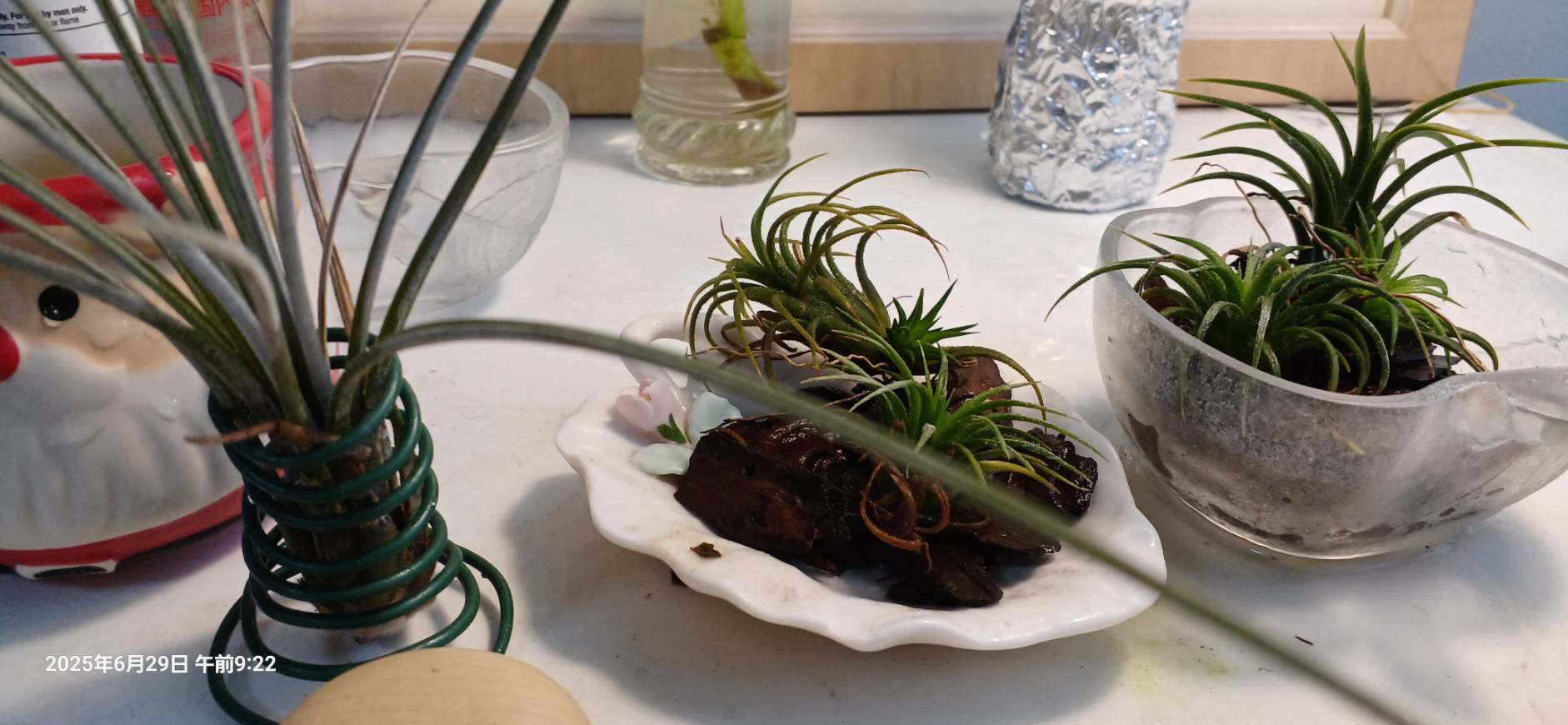 こちらは冷蔵庫の上です。 水耕栽培が やはり うまくいきません。 だんだん 整理していったら こんなに少なくなってしまいました。 まあ一応 エアプランツの 置く場所になってしまいました。