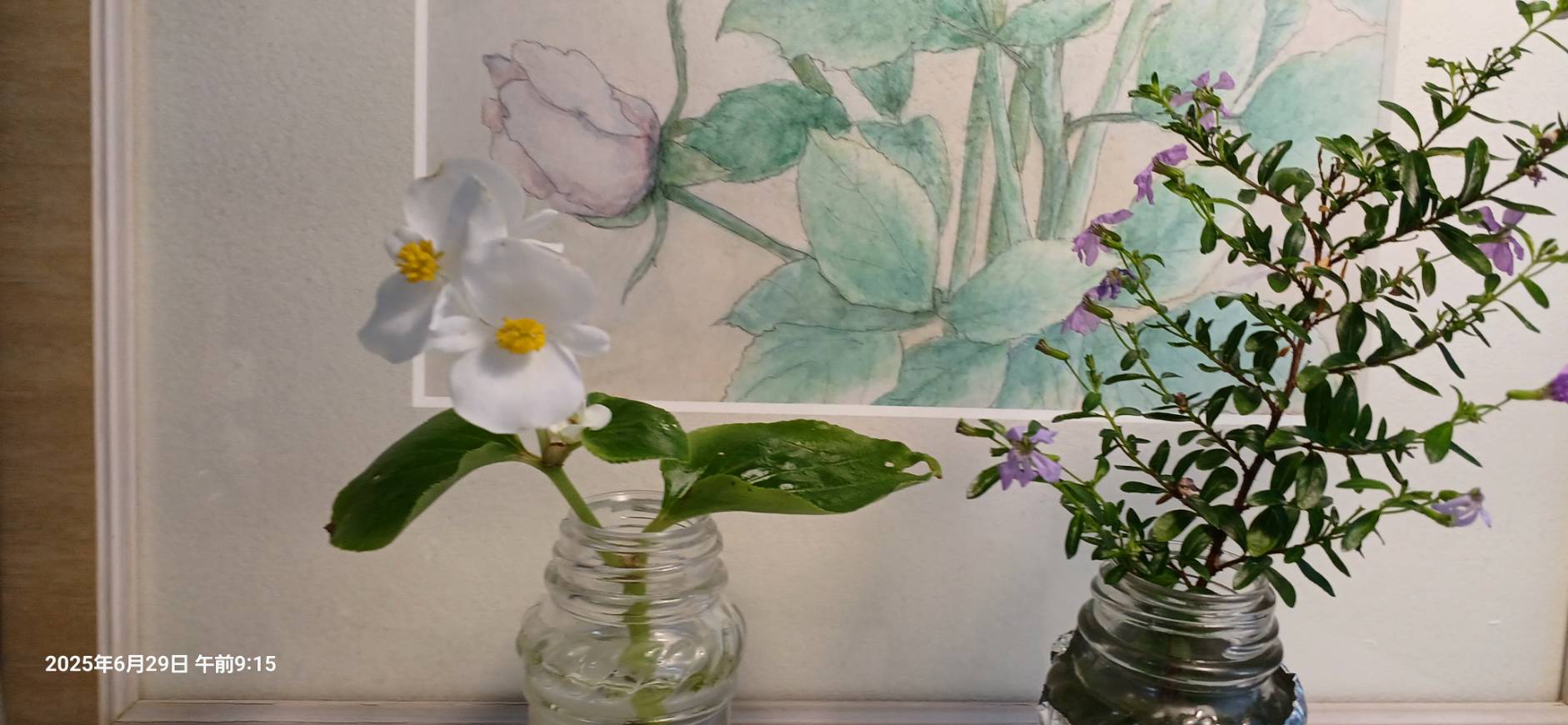 食堂の私のテーブルの上に 置いておいたベゴニアに 根が張り始めました。 私の部屋の ハーブたちも いっぱいあったのが あっという間に 数が 少なくなりました。 やはり 日当たりが問題ですが 仕方がないことです。 アップルミントが 暴れているようですが いつまでもつか? しばらくは 主人が持ってきてくれた花で 楽しもうと ミニパラに芽が出ないか 毎日睨めっこ。 葉は 枯れる様子がないので 生きては いるのですが…。 私のベゴニアも 芽が出てきたので 白い花が 次から次へと変えてくれています。 朝のひととき 瓶の様子を見るのが 楽しいひとときです。