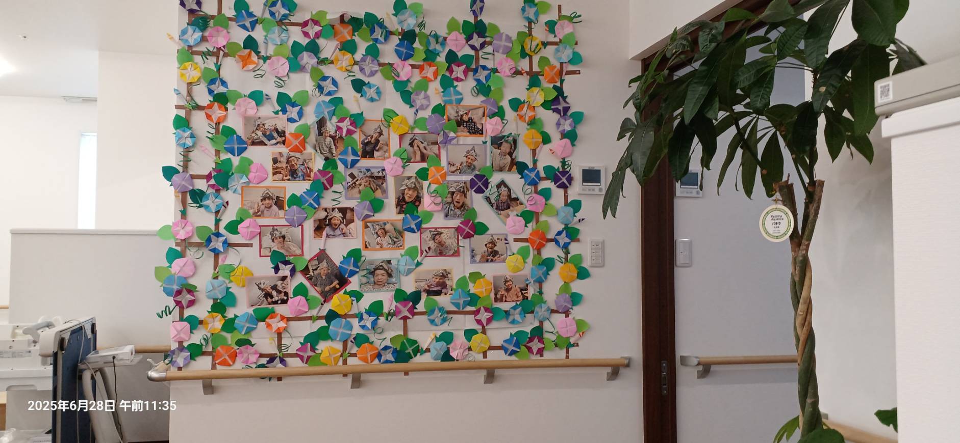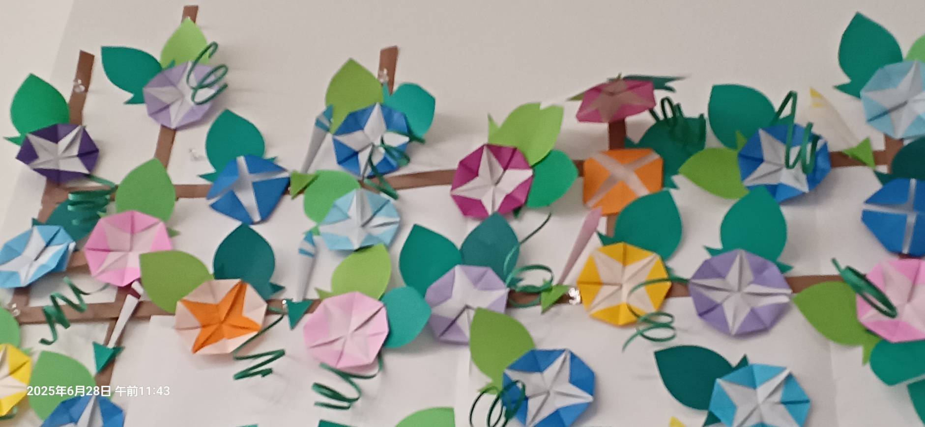 6月も もう少しして 終わるし 本格的な 暑い夏がやってくる。スタッフさんの1人が 何か思いついたようで 朝顔の折り紙 器用な人に 頼まれたようです。 色々な色で織られたものを 夜勤の間に 貼られるようです ファイル枠だけでも素敵なのに その中へ 入居者さんの写真( 5月に 兜をかぶったもの)も 貼られました。 みんな楽しそうに笑っています。 見ているだけで 私もにっこり(ニッコリ) 7 月7日の 七夕の竹も 他のスタッフさんが 用意してあるらしいので 食堂がますます 緩やかになりそうです。 明るくなるのは 本当に嬉しいことです