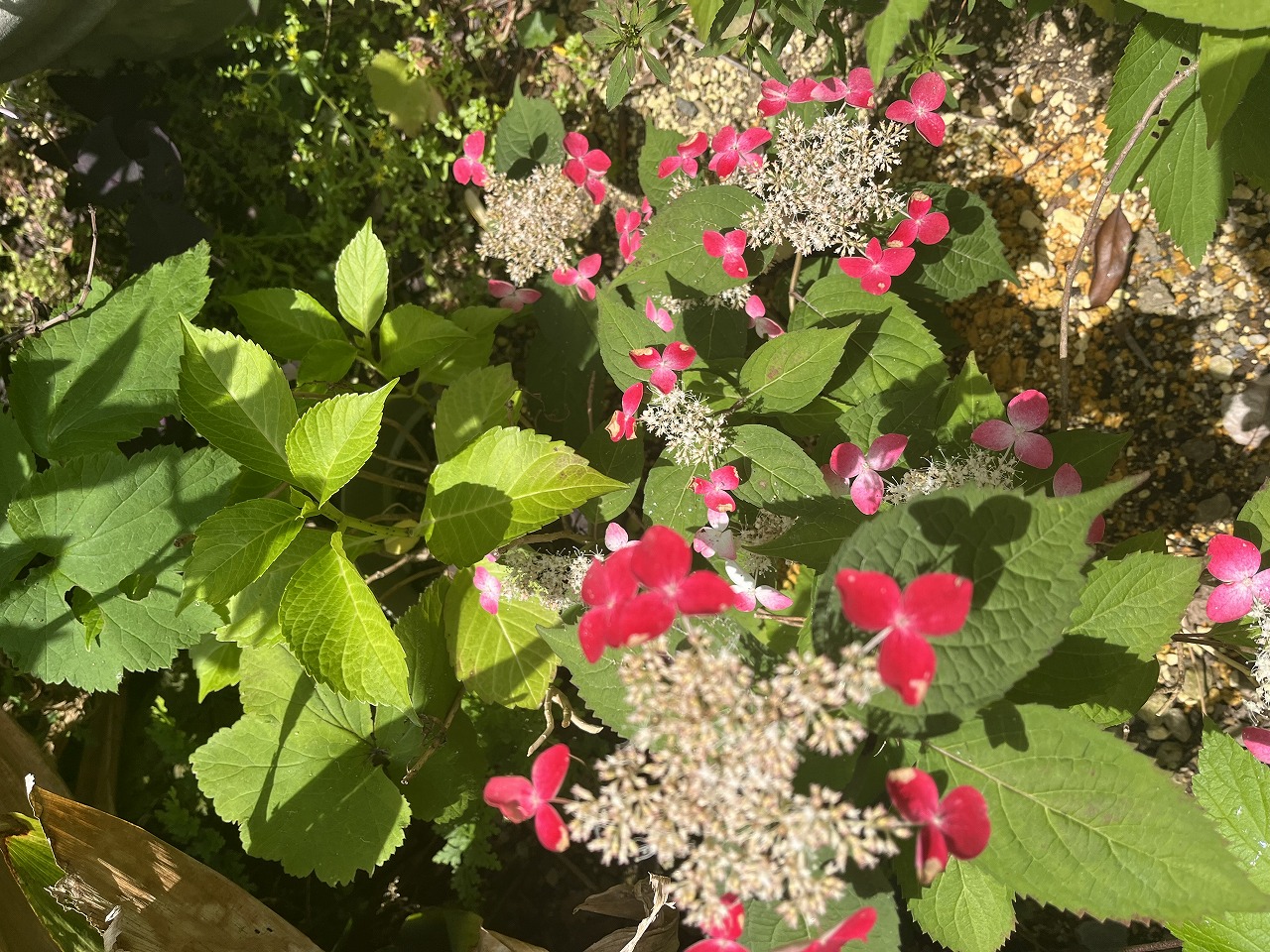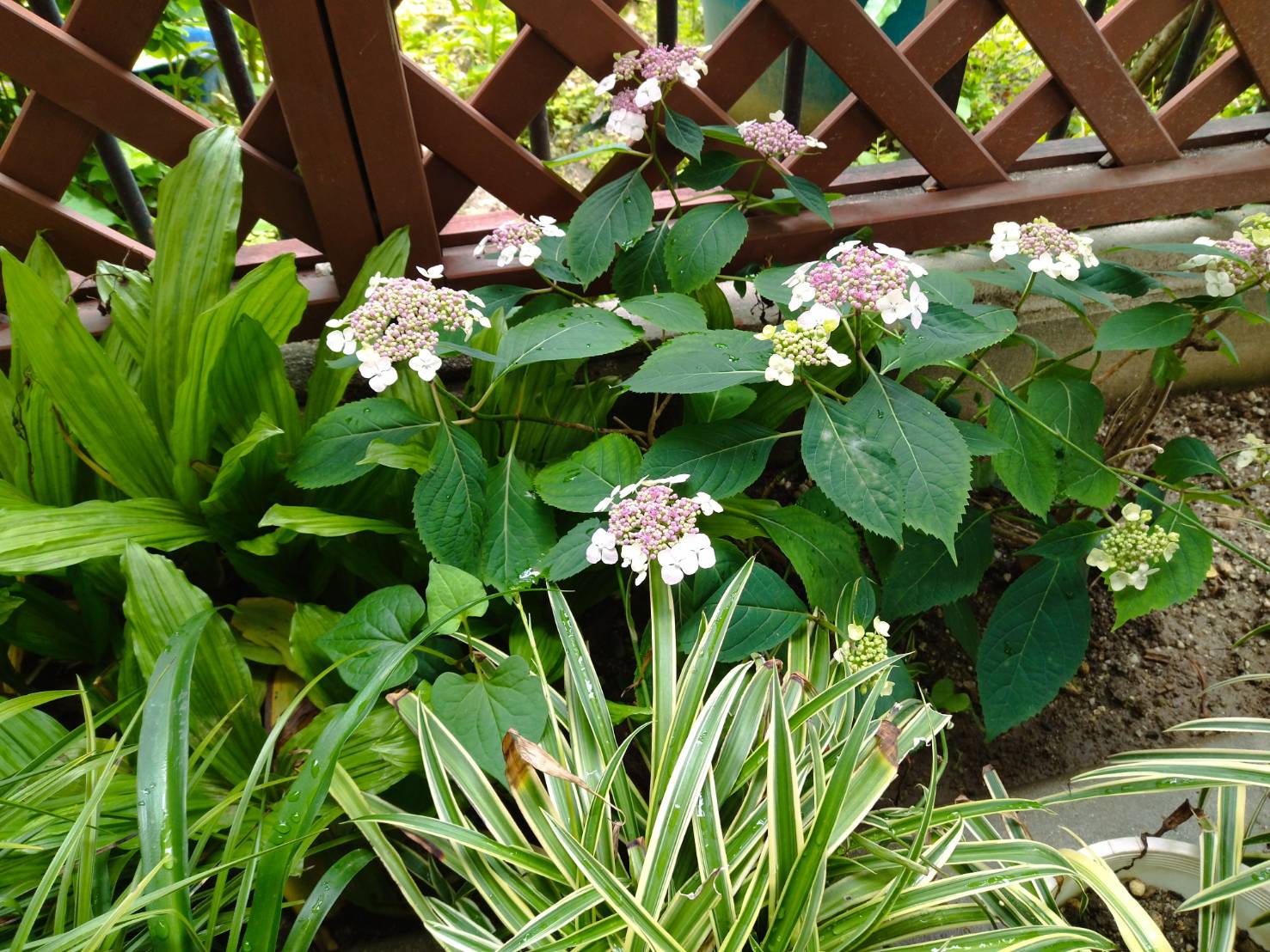 これは 我が家の紫陽花というより 甘茶です 。 前は大きかったのですが 工事の関係で なぜか背丈が 出なくなってしまいました。 でも 1列に並んだように咲いている間も可愛いですね。 よくご近所の方が 葉っぱを乾かして 後は揉んでやると アマチュアになるのだと 言っていました。 これから 色々なところで 紫陽花が いっぱい咲くのでしょう ね 。