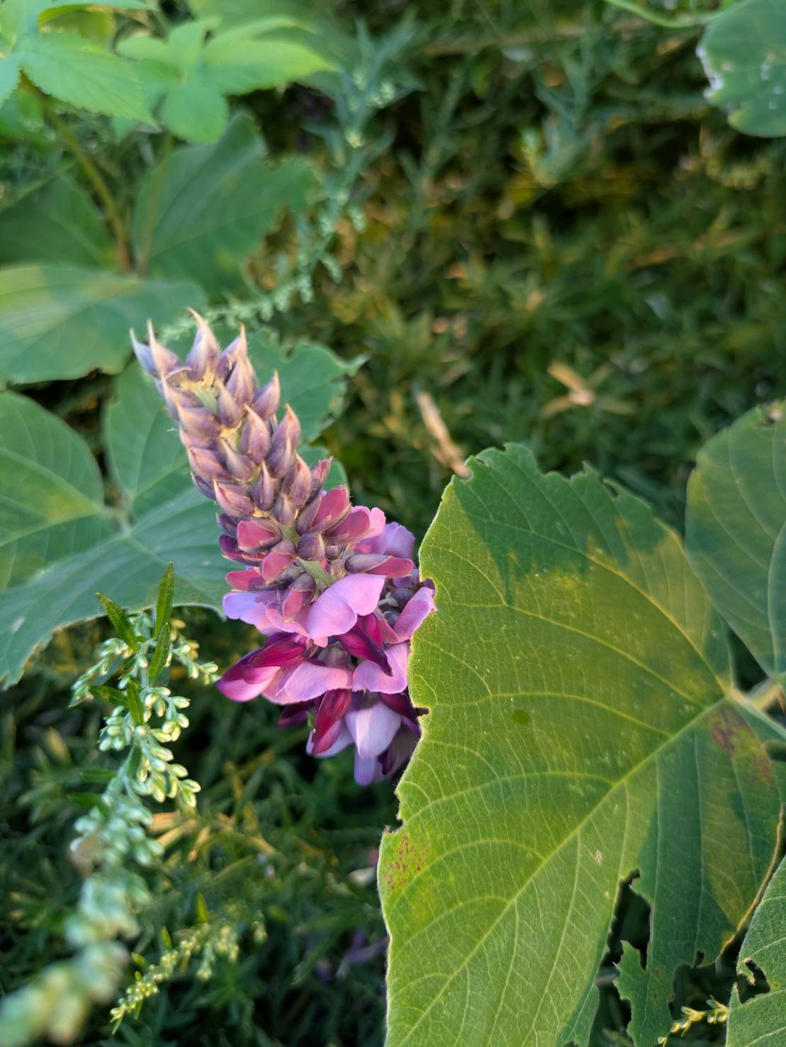 妹が毎日 山歩きしています。 山道の横に咲いていた「葛の花」だそうです。 山道の脇に大きな葉の影に咲いて 見落とすことが多いと 彼女が書いてきました。