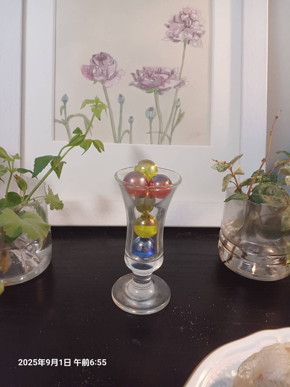 私の持ち物を 少しずつ持ってきてくれています。 その中の1つが このビー玉です。 うまく撮れていませんが 光が当たると 私の絵の前で とっても綺麗に輝いてくれます。 「こんなにいっぱい いろんなものを作ってしまうと 私の荷物を撤去する時が 大変だろうな」 なんて思ってしまいます(笑)