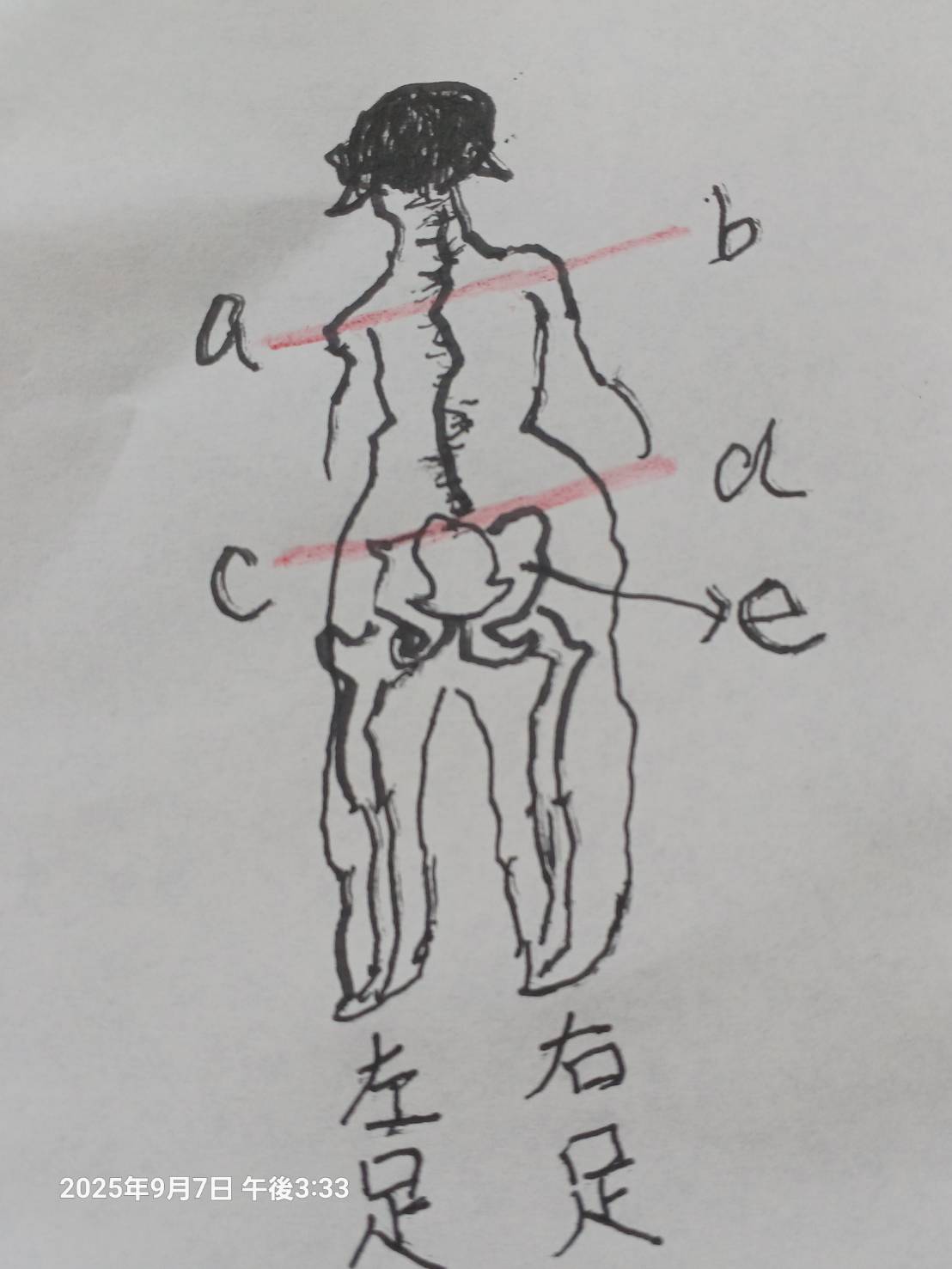先生と毎週1回 車椅子の応用で 廊下を 何往復か歩く練習をするのですが「 体幹を…」と呟かれた後 特に 何も言われないのが 気になっていました。今日は 先生の代わりに 女の先生が いらっしゃいました。 廊下で 足を伸ばす練習をしている時 思い切って 聞いてみました。「歩く時 右足と左足の長さが違うように感じるのですが?」と。 女の先生は少し考えてから「あなたの背骨が 曲がっているからでしょうね。」の言葉。 そういえば 首の方は ボルトが入ってることを よく話すのですが 背骨の圧迫骨折を 3回もやっているのを忘れていました。 それと横座りの癖もあります。左側は正常な背骨です。 右側は 何らかの衝撃を受けている人の 後ろ姿です。abの赤線 と cdの赤線が右上がりになっています。 abは 横座りを 続けてきたせいかもしれません。cdは 右左の脇の骨盤を押さえて 左右に 数センチの差があることを 教えてくださいました。 だから 右足が長く感じていることを知りました。 背骨は まっすぐに見えますが もっと湾曲しているはずです。 足の長さが違うと ドタン パタン歩きになってしまいます。 先生は 全て分かった上で 前のように 積極的な指導を なされなくなったのでしょう。無理に直そうとすると 背骨に負担がかかって この歳では 危険なことも知りました。 私が やる気を起こせば起こすほど 体調を壊すことに気づいて ただただ 歩けることを 喜んでくださっていらしたこと 歩くことを 人生の目標に決めた私に 話すことの残酷さを 感じられたのだと 初めて感じました。 感謝と真実の中で涙がこぼれそうになりました。 でも 先生のお気持ちを 受け取って また新しい気持ちで 私なりの歩くことを続けようと 思っています。