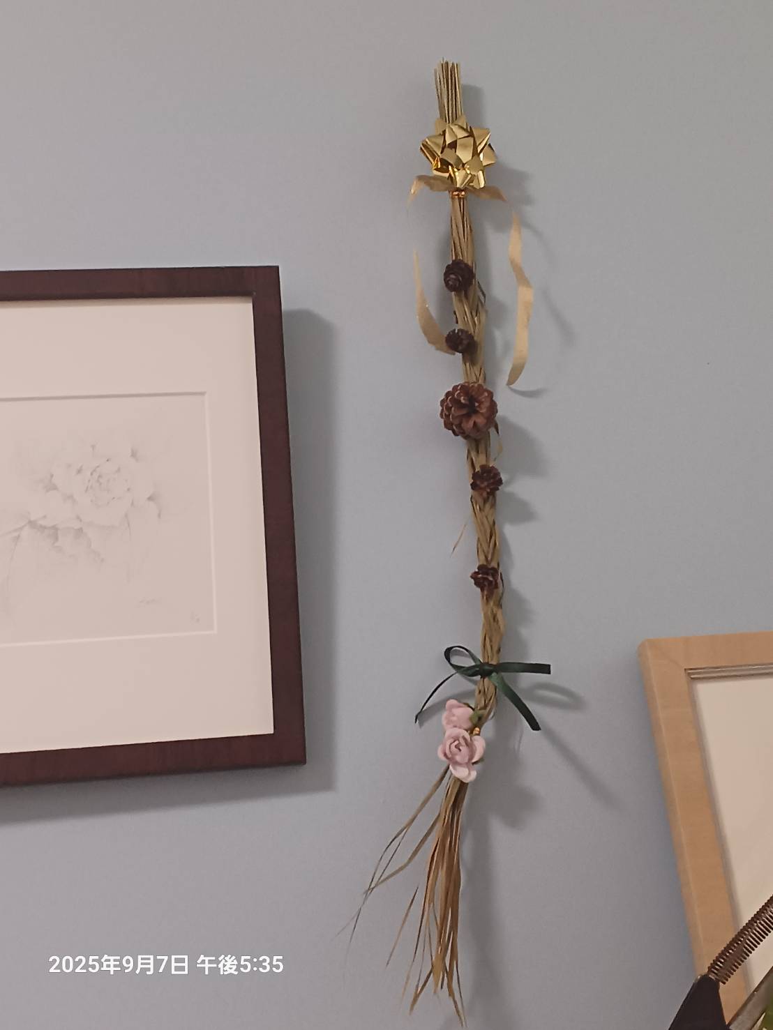 これは今年 レモングラスティーを差し上げたものの 残りのレモングラスの三つ編み飾りです。 家には 昔作った もう少し華やかなものが 飾ってあります。 足の親指を使って三つ編みを 編めたのですが リボンがどうやっても結べません。 セメダイもなかったので 主人が来てくれる日を待っていました。 松ぼっくりや木の実の間にも リボンを結んでもらうつもりだったのですが 主人でも無理だと思ってやめたのが かえって良かった気がします。 私の絵の間に置けて 嬉しいです。