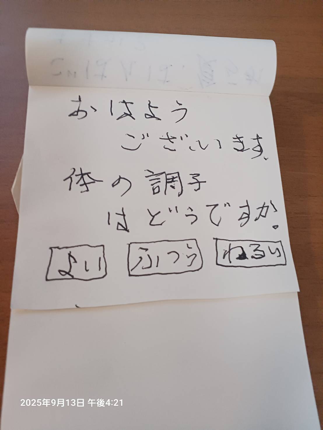 今 この歳で 施設生活。いろんな方がいらっしゃいます。食堂には いくつかのテーブルがあるので たまに 他の友達のところへ行って 話していました。 当然 他の方とも 目があって 笑顔で 手を振って ご挨拶。 一番奥のテーブルの方が 右腕が 動かなくなったことを 知りました。 耳は 全く聞こえないことも。 そこで 最初に ひらがなの お手紙を差し上げました。 その場で 読んで 理解してくださったようで 隣の方も「分かったみたいよ」と 言ってくださって ホッ! それから こんな言葉を書いたり その場で お返事が書けるよう 用紙とボールペンを持って食堂へ行くようになり ました。 一生懸命 その日に書いた 短い 文章を 呼んでくださって「ありがとう」と 小さい声で言って 素敵な笑顔や 手を握ってくださるのが嬉しいいです。 耳の遠い方は まだ 他にもいらっしゃいますが まずは 心の辛いこの方の 慰になればと 願って やっています 。