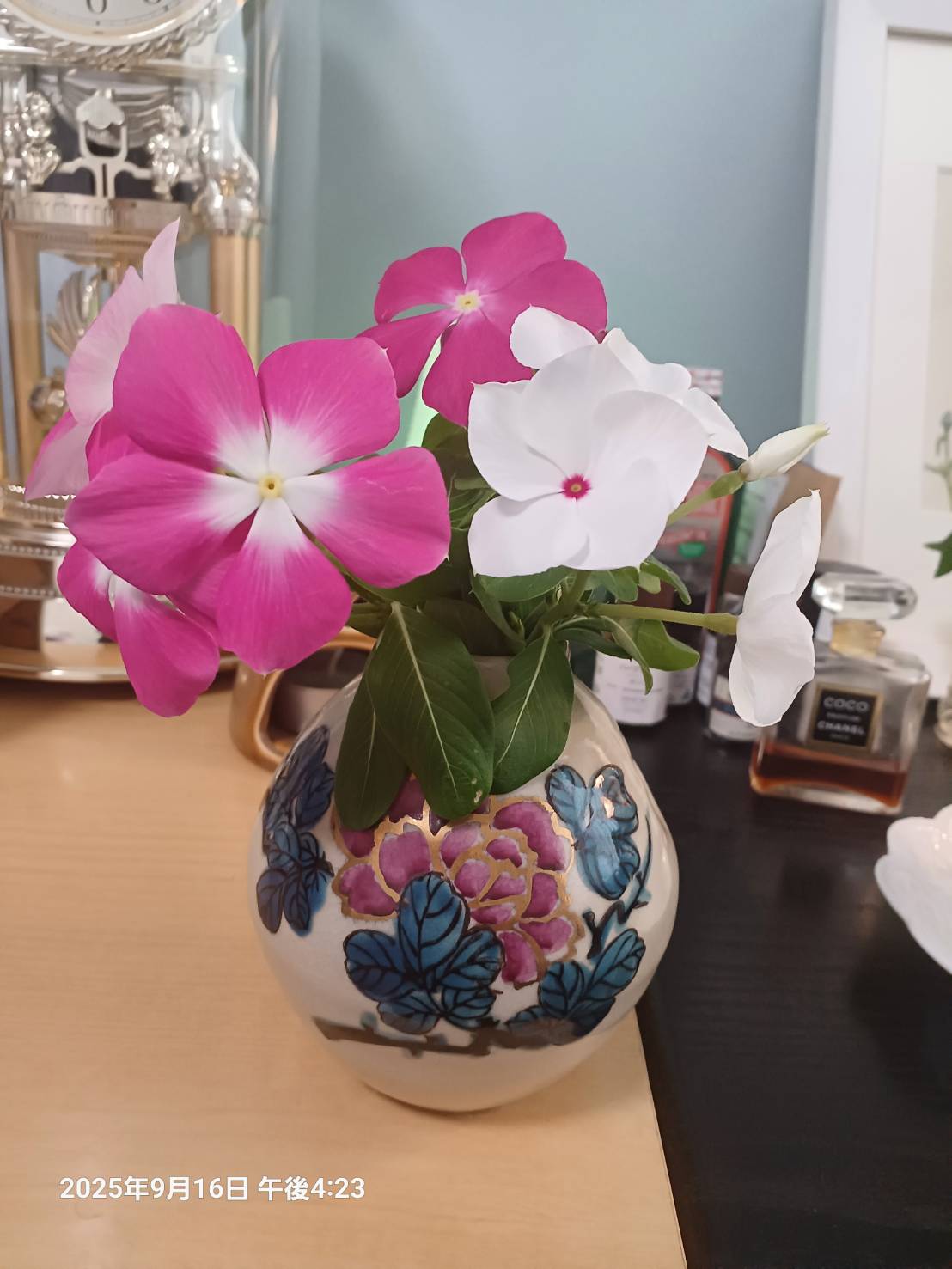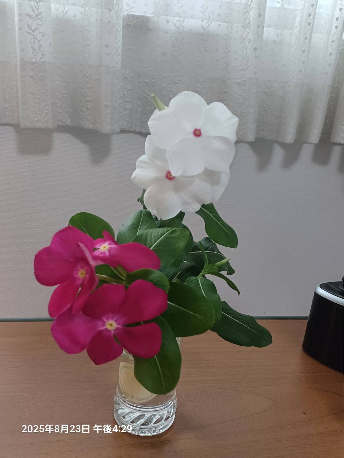 これは主人が 持ってきてくれた家で咲いている ニチニチソウです。 夏に強い花だということは 皆さんよくご存知のはずですよね 。 でも私が 今までに 部屋に置い た花の中では こんなに元気で 素敵な花色を 出すものは初めてです。 主人は「ただ 朝晩の水やりをやっているだけ」 というのですが…。 今まで持ってきてくれた庭の花も 皆素敵! 私も声かけをしたり 切り戻しをしたり 栄養を入れたりして 頑張っているのですが …。 そんなことは どうでもいいことです。 この施設の中で 庭の花を 見られる嬉しさ。 それと主人の気持ちも…。 毎朝「元気ですか?」と言ってくれているようで嬉しい朝です。