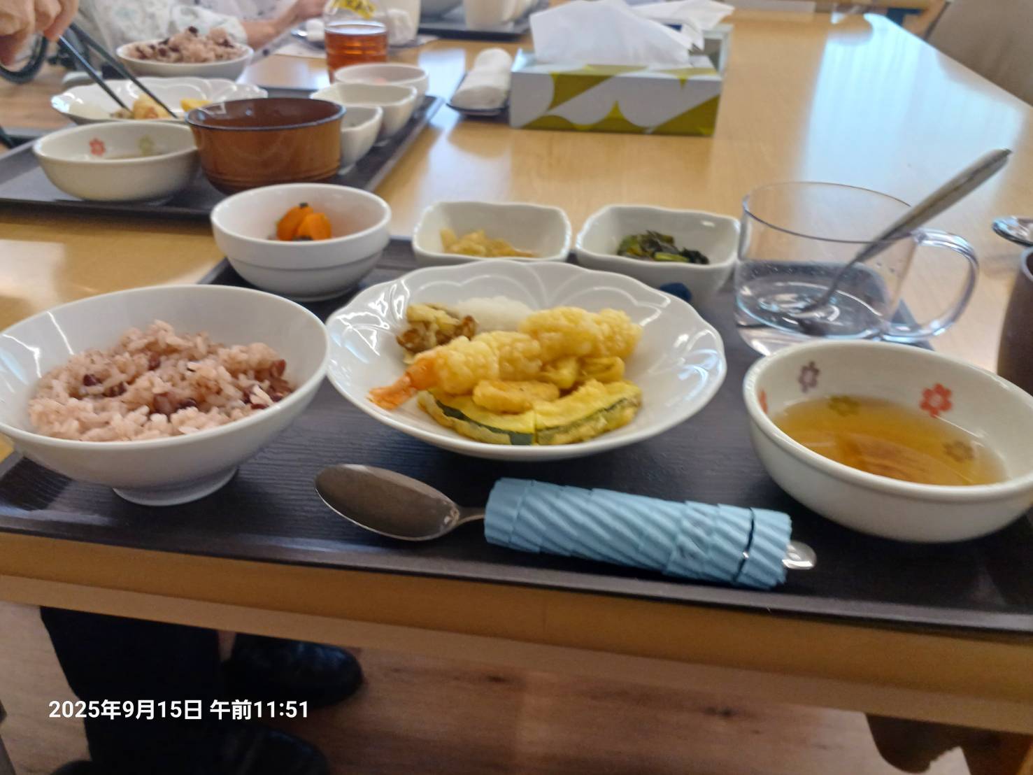 今日は「敬老の日」(写真の関係で 載せるのが遅くなりました) 朝ごはんの時から「今日は何かあるわよね」とテーブルの人と 話していました。午前中は 何事もなく 特別の連絡もありません。「もしかしたら お昼ご飯かな?」と思った。私は 昼食にスマホを持って出かけました。 なんとなく気が せいていたのでしょう。 いつも11時45分に 部屋を出るのに なんと11時15分に出てしまったようです。 食堂には 数人いましたのですが その中で タオルを畳んでいる方が いらっしゃいました。 そこでそれを手伝うことにしました。 それを終えて自分のテーブルに 戻って いよいよ待ちに待った お昼ご飯。 第一報が「お赤飯があるそうよ」の声に テーブルの3人は 大喜び。いよいよ目の前に お膳が 、、、お赤飯に 大きなお皿に 天ぷら(大きな海老に かぼちゃなどが 数種類 ) 天つゆ 、わかめの酢の物、 お味噌汁。 友達の1人は お赤飯を見た途端に「大盛」にしてもらって 満足げ。 皆さん 目を疑うような献立を いっぱい食べました。