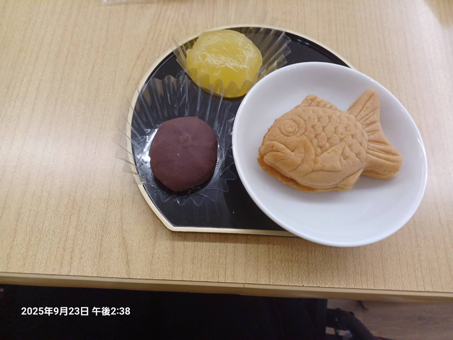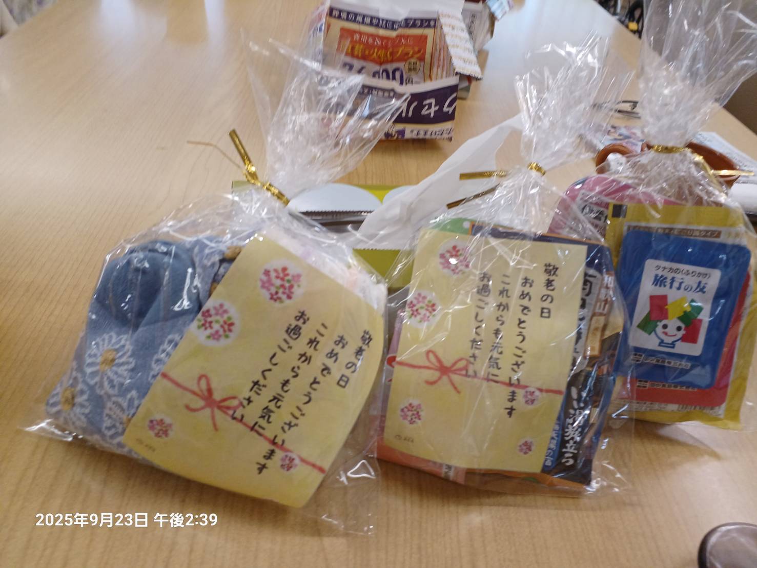 ビックリ!ビックリ! 少しゆっくり行ったので 机の前に可愛いお皿の上に乗った和菓子が3個。 それにお土産を1個。 少し遅れた敬老の日と知りました。 こんなことは初めてです。 お茶席でも座った気分です。どのスタッフさんが 用意なさったのか分かります。今日は夜勤を受け持ってらっしゃるのに…。 体を壊さないかと心配です。可愛いお土産を3人分まとめて写真に撮りました。一人は 靴下2足が入っていたと 大喜びしていました。 後の私たち二人は ふりかけ3個と 入浴剤3個が入っていました。 ふりかけを待っていたように1人は 次の日にご飯にかけて食べていました。 プレゼントを持って 一人ずつ写真を撮ってもらいました。 みんな笑顔でと いうことだったので 私も ちょっと乗りすぎて お茶目なおばあさんに 撮れてしまったみたいです。 後で 全員の写真を 貼り出してくださると思います。 その後 一人一人に写真が 渡されるはずです。見るのが 嬉しいような怖いような…