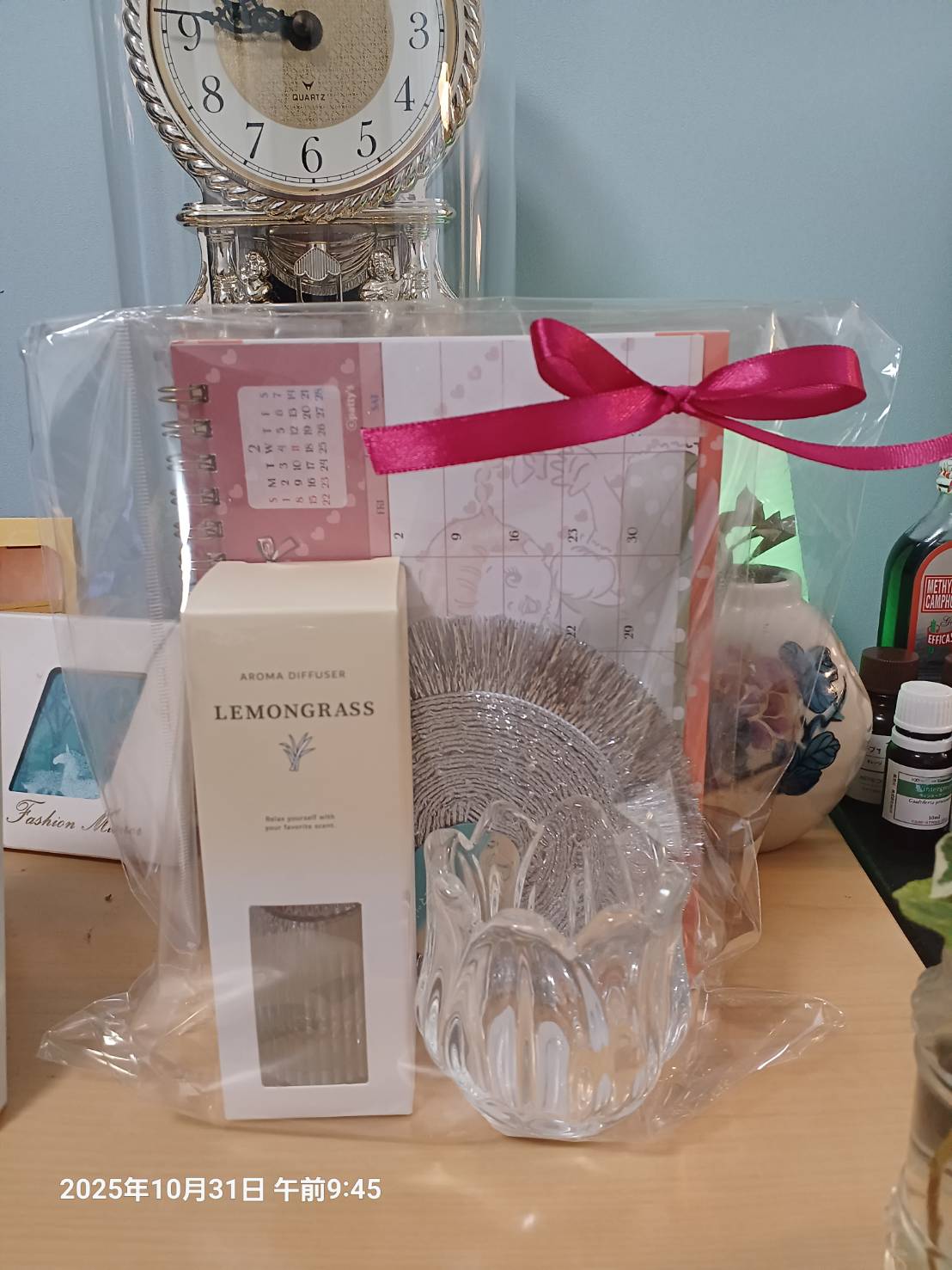 「10月の誕生日の人へのプレゼント お誕生日おめでとう。 これは私が選んだのよ。」とスタッフさんから素敵なプレゼントを いただきました。 プレゼントの内容は それぞれの方が 好きなものを 考えて選んでらっしゃるようです。 私は ハーブが大好きなので レモングラスの香りが 部屋に広がるように 工夫してあるものと 植物を部屋で育てているので 素敵なガラス瓶に 素敵な下敷きも頂きました。 こんなにしていただいて 大丈夫なのか心配になるくらいです。 本当にその人の好きなものを選ぶというのは 大変だったでしょうが 私は とっても嬉しいです。でも あっという間に10月が終わりますね。