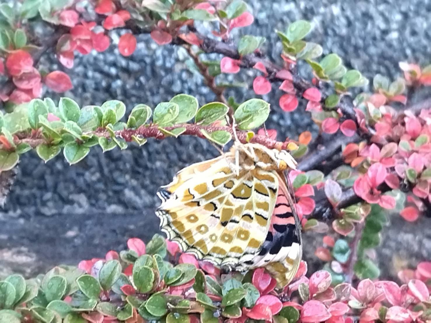 これは 我が家の 外塀に使ってある岩に沿って 育っているベニシタンに 変わった蝶が止まったと 主人が送ってくれた写真です。 ちょうちょも本当に変わっていて 素敵なのですが ベニシタンの紅葉や 岩の色の中で ますます素敵に見えるちょうの一瞬を 素敵に撮ってくれた主人に 感謝です 。