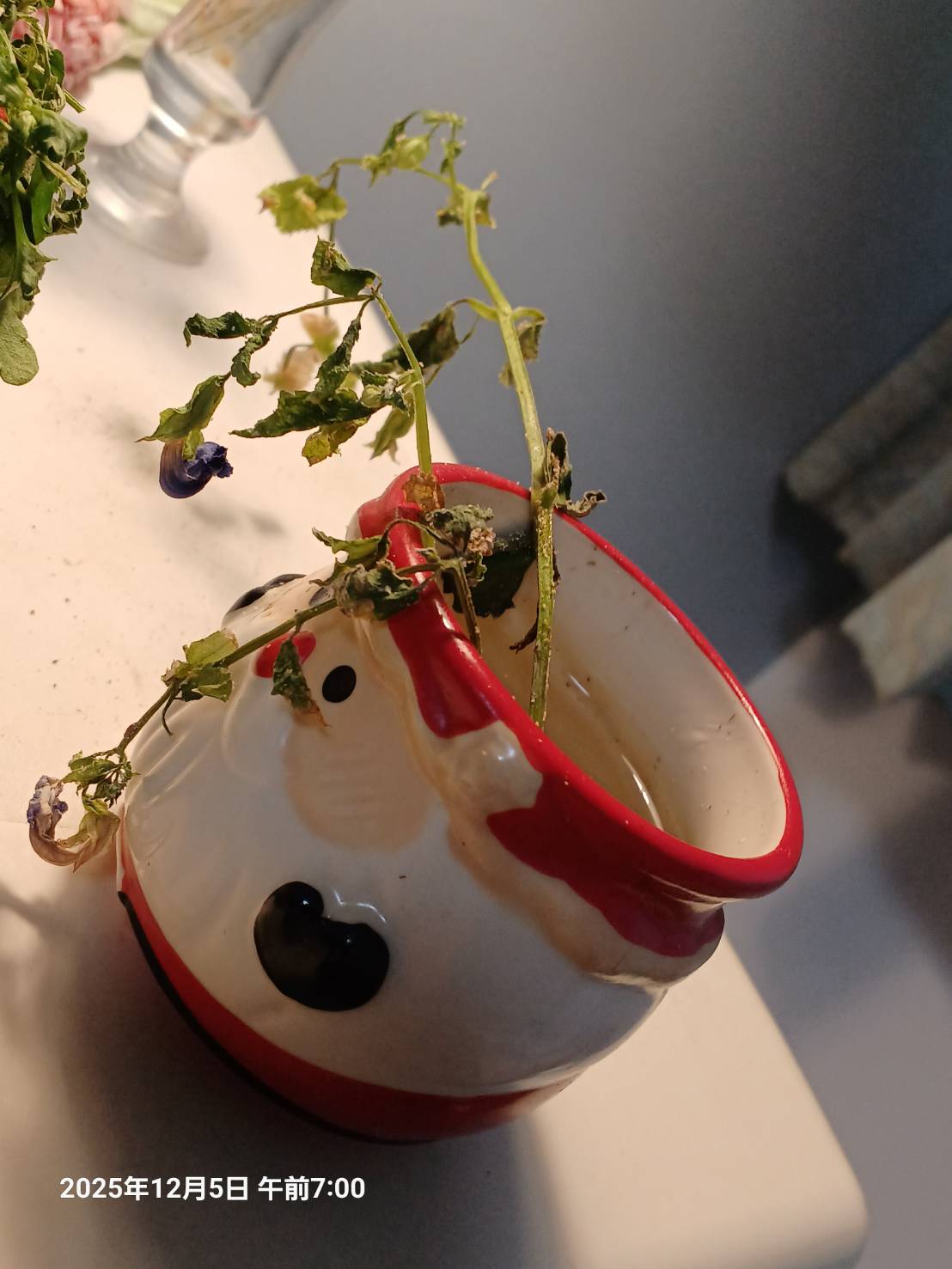 昨日は すごい風で 小さなヴィオラ が 飛ばされそう 。 窓から手を出して スマホ を持っていた 私 の 手 も 揺れて うまく 撮れません でした。 次の日 そっと のぞいてみたら 花 がかろうじて 立っていました。 ごめんね 私のわがままで こんなところに置いてしまって…