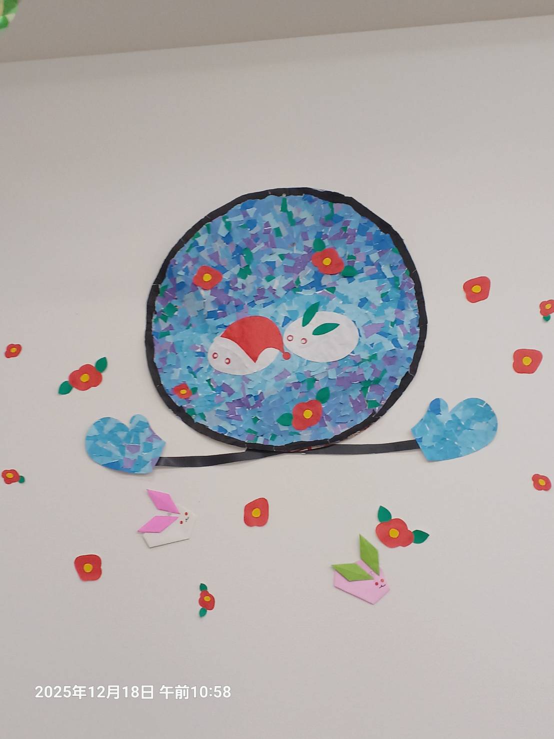 これも 円形のところが 見事な 貼り絵になっています。 この色合いが とっても素敵です。 サンタさんも 嬉しそうに 顔を出しています