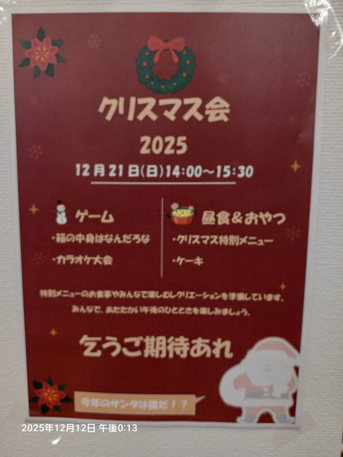 ここに来て 調子が悪く 食堂に出てくる人が少なくなって 寒々としています。 どうぞ皆さん 頑張って元気になってください。 スタッフさんたちが クリスマスに向けて 色々な準備をしてくださっています。 そのクリスマスの日までに 元気になられますように!