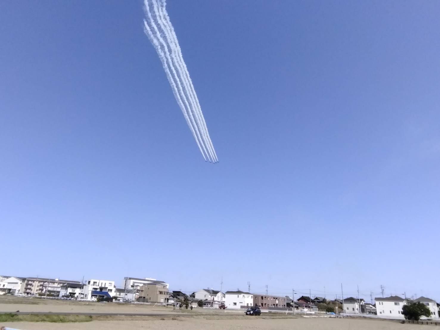 先日 ブルーインパルスが飛びました。 家にいた時は 田んぼの方に出て 素敵な飛行を 何度も見ましたが ここでは いろんなものが邪魔して うまく見えませんでした。 それでも 5つの丸を作った時の写真を 取れた方がいらして 後で下さいそうです。 みんなで 駐車場に出たのに ちょっと残念でした。 下の画像は 主人が撮ってくれたものです。