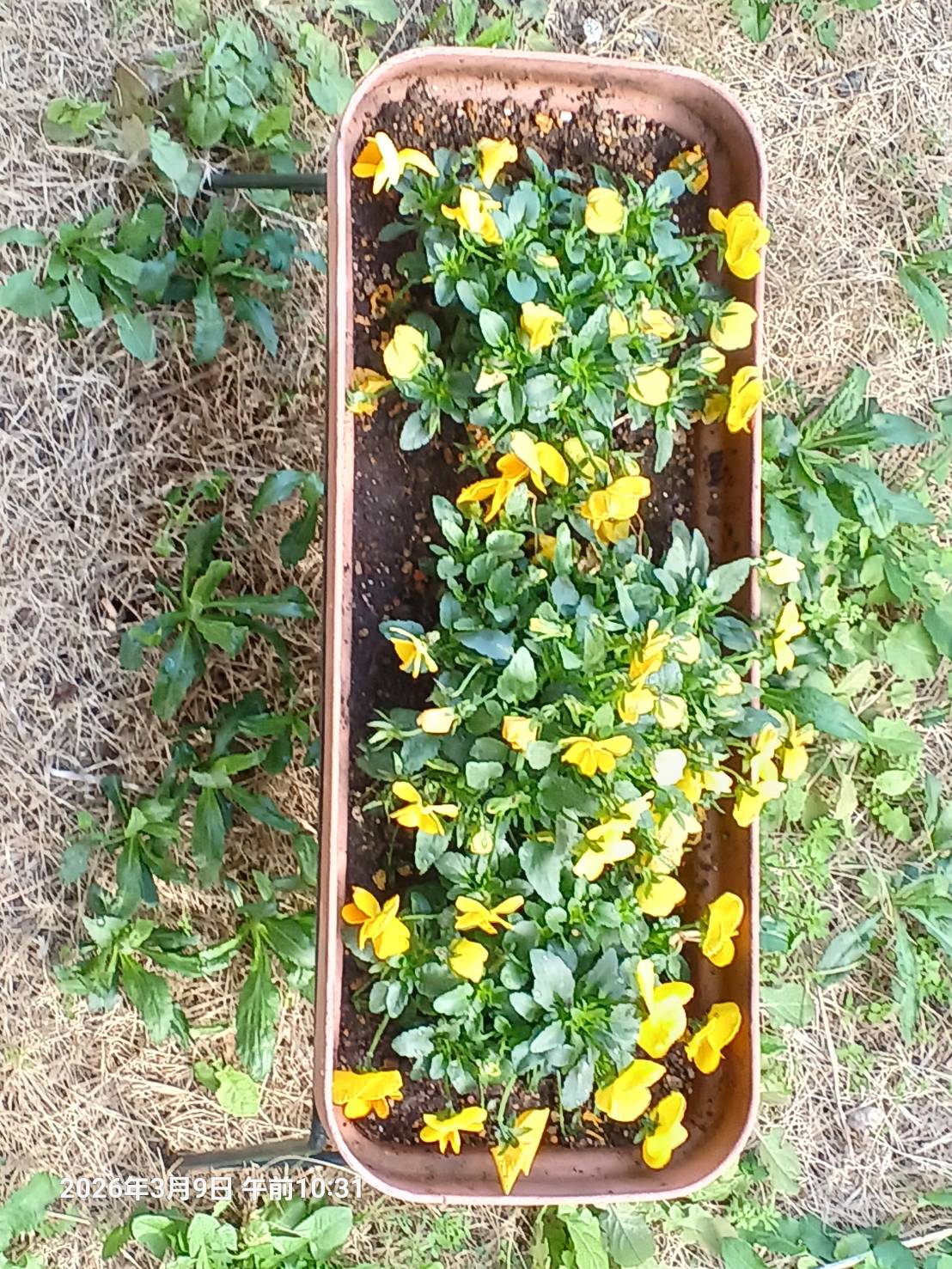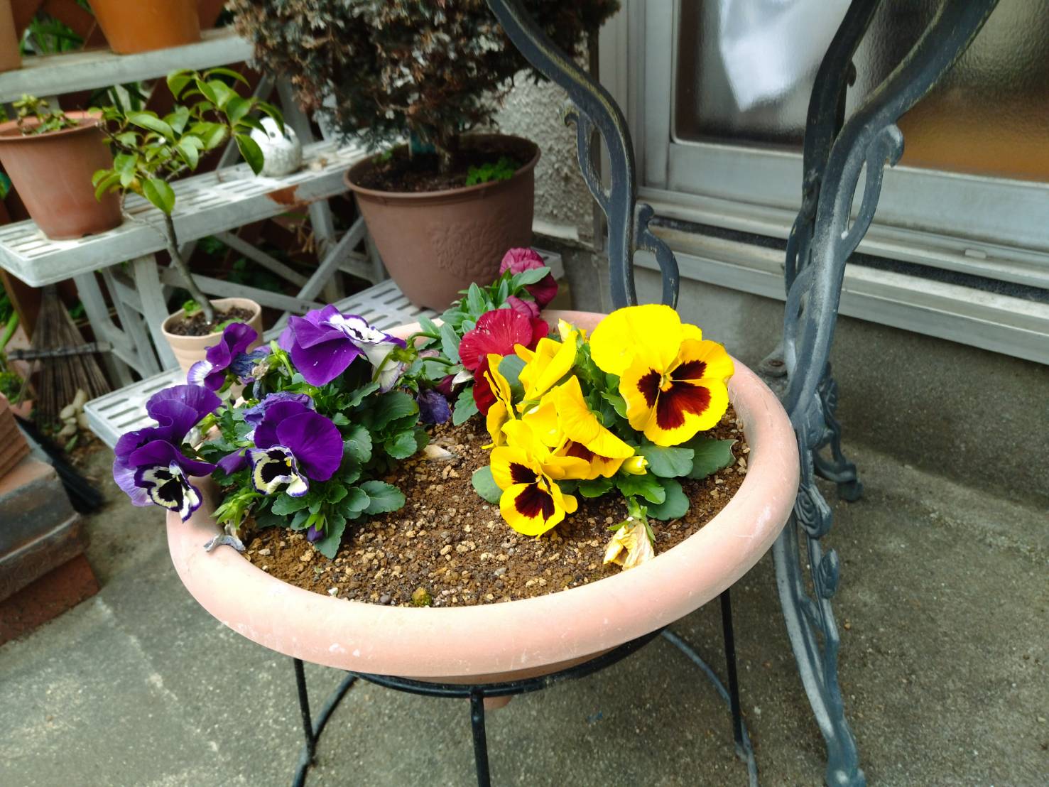 こちらには 窓の下に ビオラが植えられていますが 風が強く 一生懸命 耐えている姿は かわいそうでした。 こちらに持ってきたら こんなに穏やかに きれいに咲くはずは なかったと思います。 家の庭で育って良かったね。