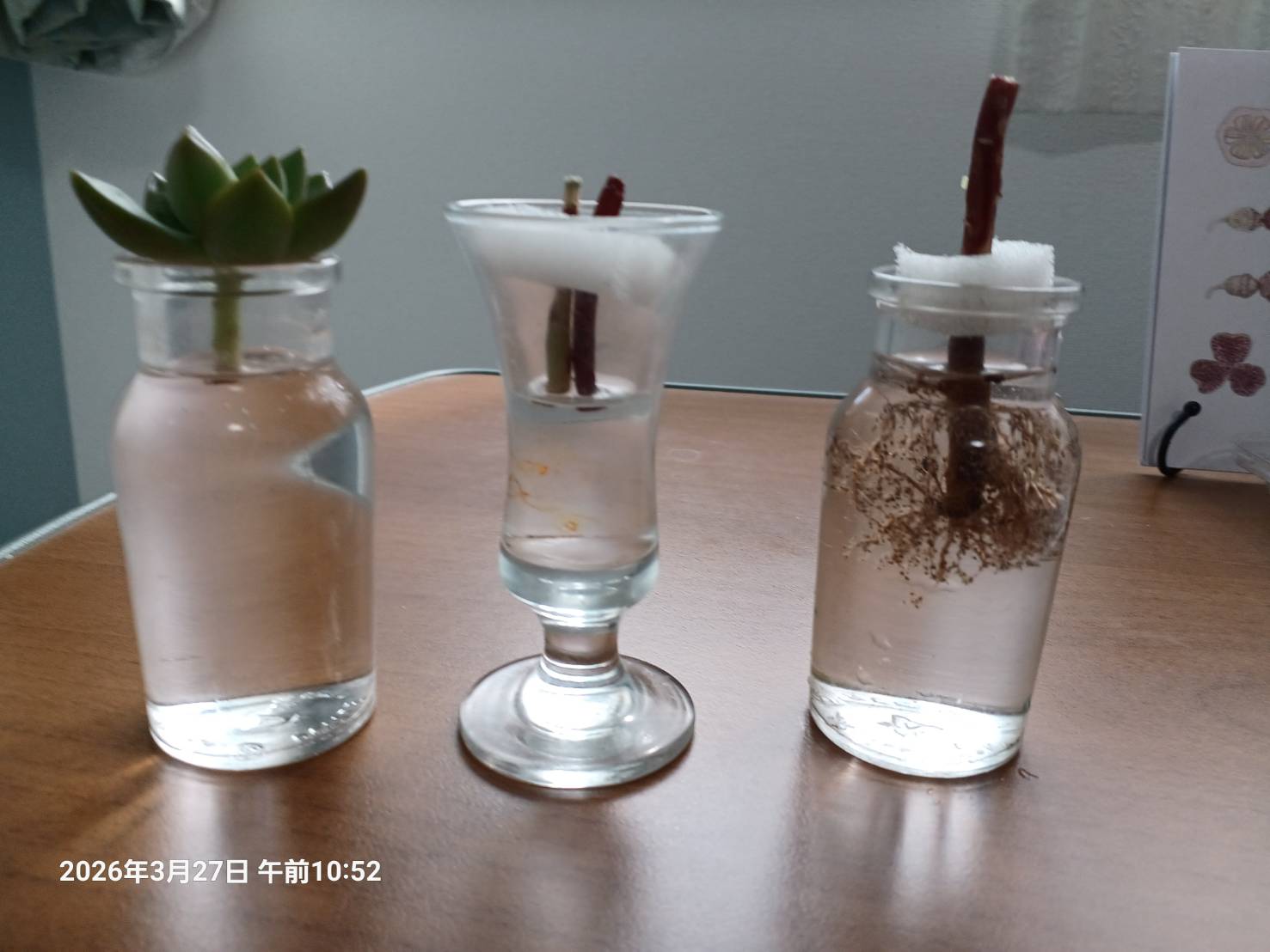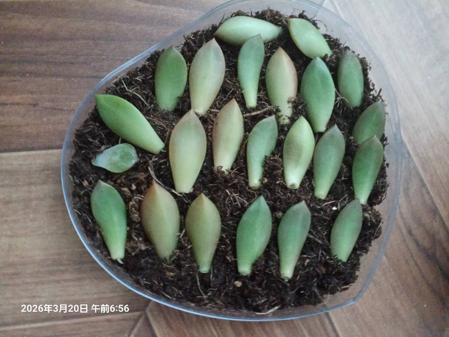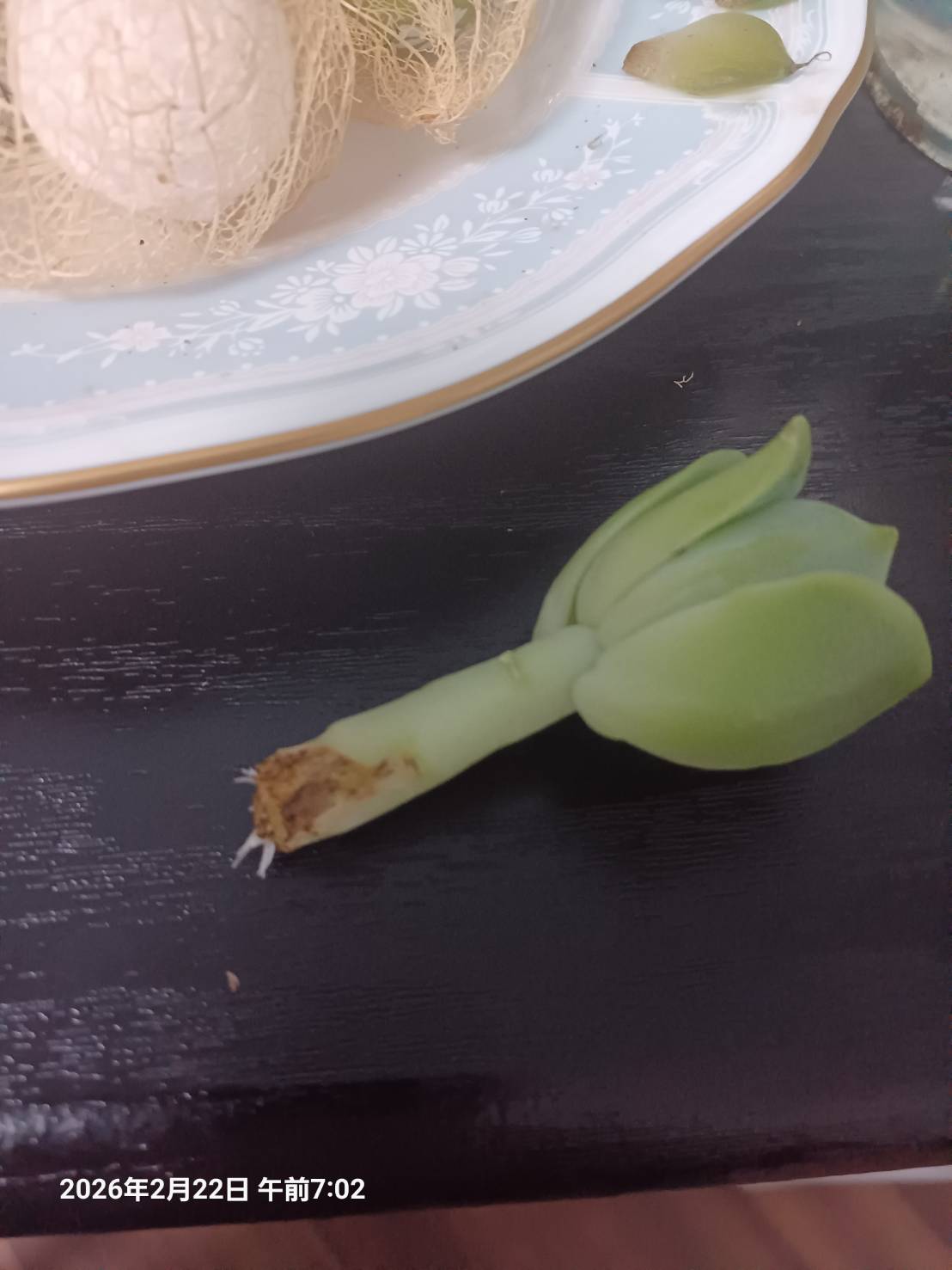 何年前でからだったでしょうか 多肉植物に凝ったのですが 家に置いたまま この施設に入りました。 主人が「花が咲いたぞ」と知らせてくれるたびに 私の時には 花が咲かなかったのに あまり興味のない主人が育て始めたら 花が咲いて 驚きました。そんな私が「何でもいいから 多肉植物を持ってきてください」といったものですから 持って来てくれたのはいいのですが 茎が曲がって 20cmから30cmほどあるものが 届きました。「絶対に これは 胴切りか 葉挿しだわ」と 思いました。 のびた茎の上に 可愛い花のような葉の塊を大切に切って…。 どう考えたのはいいのですが 茎の太さに大小があり 色も違うのが 気になりました。 そこで なるべく良いところを 切って どう切りに、、.。 葉刺しにする葉が いっぱい取れました。土がうまく取れて 白いねを待つのみ。 出来上がったのが 写真の左から頭 次に胴 そして根っこ です。