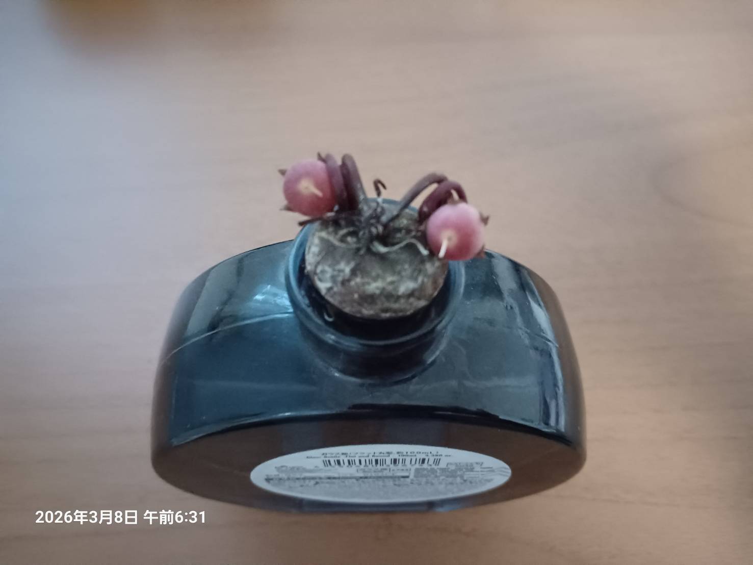 親友にもらった 小さなカレンダーの中についていた シクラメンコウムが欲しくて たまらなくなって 主人に買ってもらったのに 葉っぱが落ちて こんな形になってしまいました。 土はここでは使えないと思いながら まだ成功していない 水耕栽培にしてしまったのが 今回の原因です。 でもまだ ピンクの丸い 蕾が2つ ついたまま。 いつ咲くのか いつ縮んでしまうのか 全く分かりません。 お日様だけには当てて 毎日呼びかけていますが どうなるのでしょう? 杉ゴケに包まれて やってきたのに やっぱり私の願いは 叶わなかったようです。 土を使えば 簡単にできることなのですが 施設では 土を使ってはいけないということで 水耕栽培にしたのが間違いでした。 家に持って行って 主人に預けた方が成功したと思います。 可愛い可愛いピンク色 の… せめて一花でも 咲いてくれるといいのですが …。