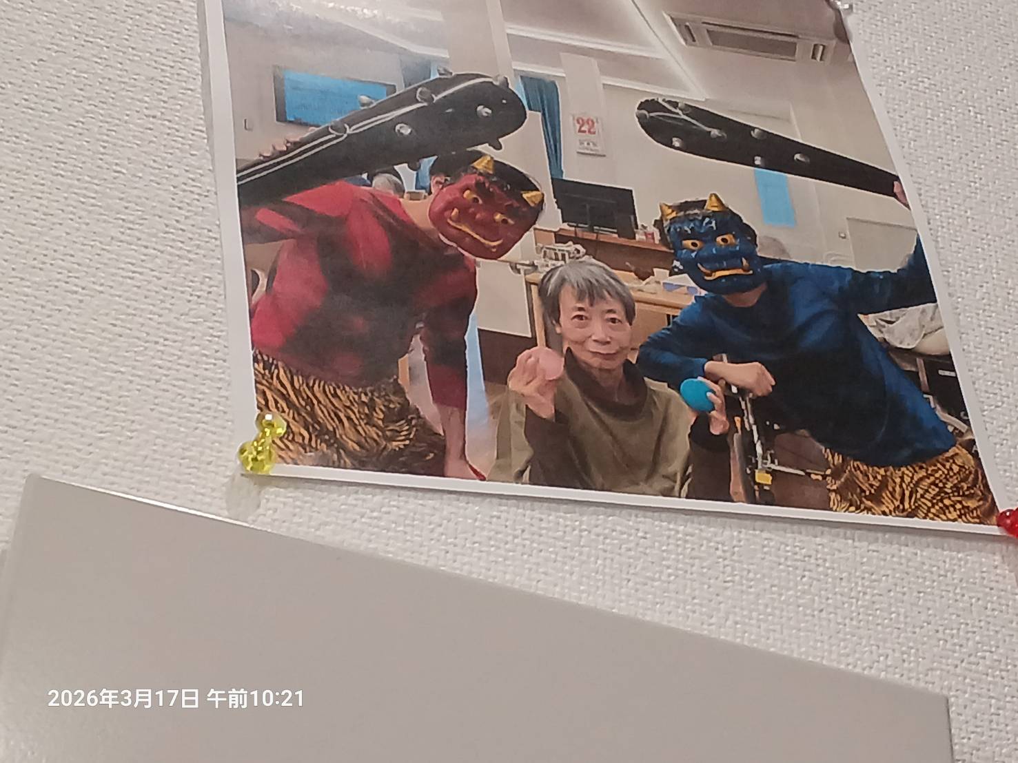 小さなボールを ボウリング大会の時に投げたので 手に持っています。 赤鬼さんと青鬼さんを見ていると 3年前になるでしょうか 前の施設長さんが 寝たきりだった頃の私の部屋にも 節分の豆まきをしてくださったことを 思い出します。 とってもいい方でしたが 今はどうしてらっしゃるのか 分かりません。 もう一度お会いしたい…。