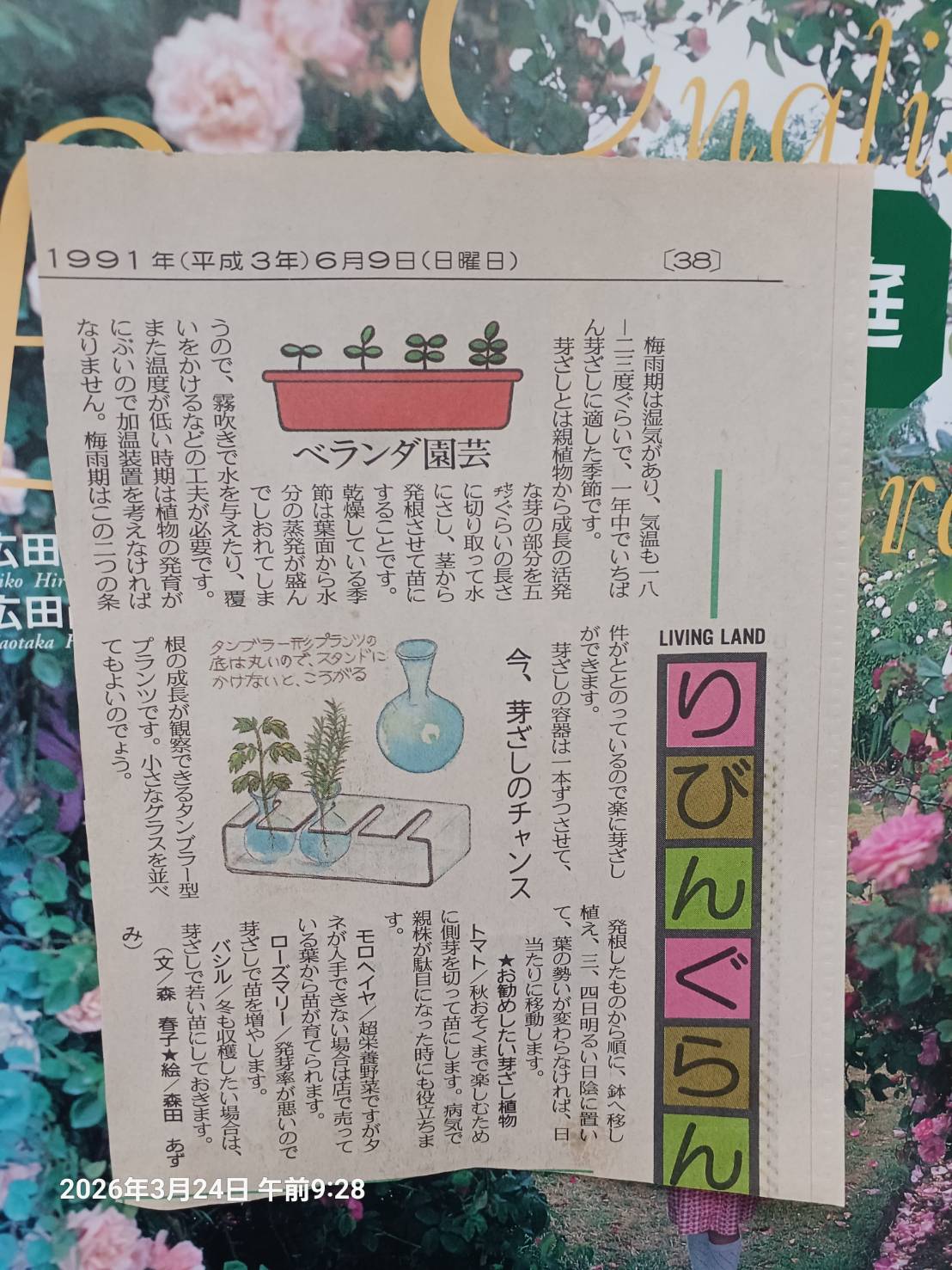 今 私がやっている 水耕栽培の簡単なものに書かれた 新聞の記事です。 6月は 芽挿に適した 季節とありました。 1つ勉強になったのは トマトの芽指し。秋遅くまで楽しむために 側芽を切って 苗にするのだそうです。それと この切り抜きを見て 私は だいぶ前から 水での栽培が気になっていたのだと 改めて 思い返したひとときでした 。