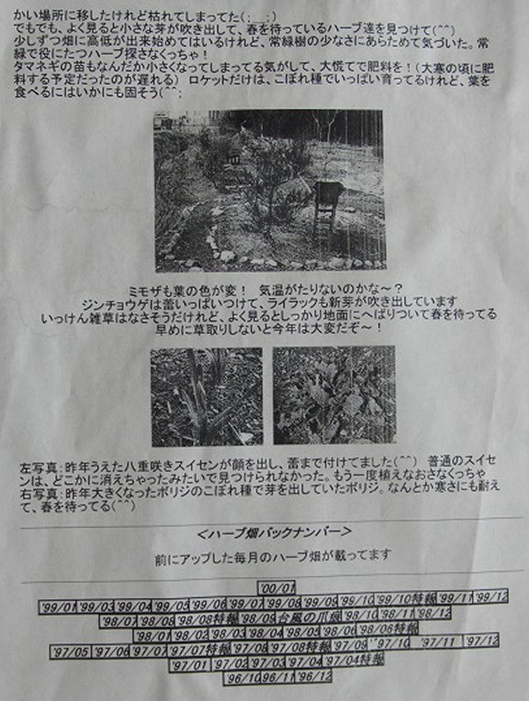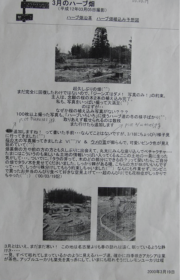 今の所、この画像しか、ありません。見にくくて、ごめんなさい。 広い山裾に、眠っていた場所があったので、開墾しがてら、ハーブ達を育て始めました。柵も手作りで・・・・ 最後の頃には、レンガの窯もでき、主人の会社の方たちと、バーベキューまで、できたんですよ。 でも、今は、手におえない程、荒れてしまい、管理できなくなって、この土地も人手にわたりました。