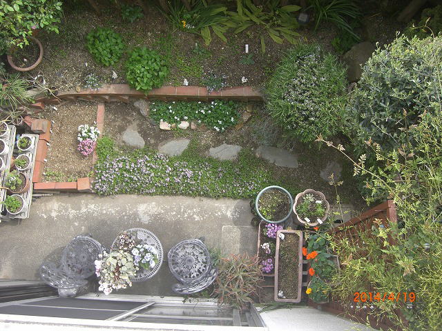 タイムの芝に花がついてきました 白花スィートバイオレットも花盛り 種を蒔いた場所は、ロケットが勢いよく成長していますが、他のまだ・・・出て来るんだろうか