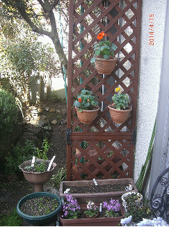 古いトリリスですが、庭の良い区切りになってくれています。 幅も狭いので、沢山の鉢はかけられません。でもビオラなどはよく合います。 これは、ベコニアの後かな〜? 下のゴタゴタしたプランターには、春になったら、カモマイルの種を蒔こうと思っています。 このトリリスの上あたりにオリーブのまあるく刈られた葉が見えるのですが・・・・・ この奥の場所にラベンダーを植えるつもりをしています・・・あくまで予定(笑)