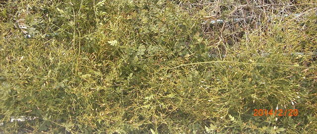 棚を2階から写した画像です。 何がなんだか、解らない状態ですが、良く見ると、白いジャスミンの蕾が見えます。 最初は、ブドウの棚で、実もしっかりついたのですが、最近は、まったく実がつきません。 で、道路側に伸びて行ってしまうジャスミンを、こちらに誘導しました。 繁殖力は、旺盛で、冬でも、この有様です(^^;
