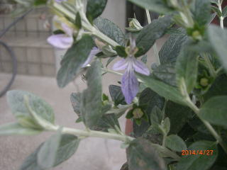 植木鉢のジャーマンダの花 けっこう大きくて、でも薄い・うすい紫色 葉の色が毛ばたったようなグレーなので、 花の存在が、解りにくい・・でも、可憐 |